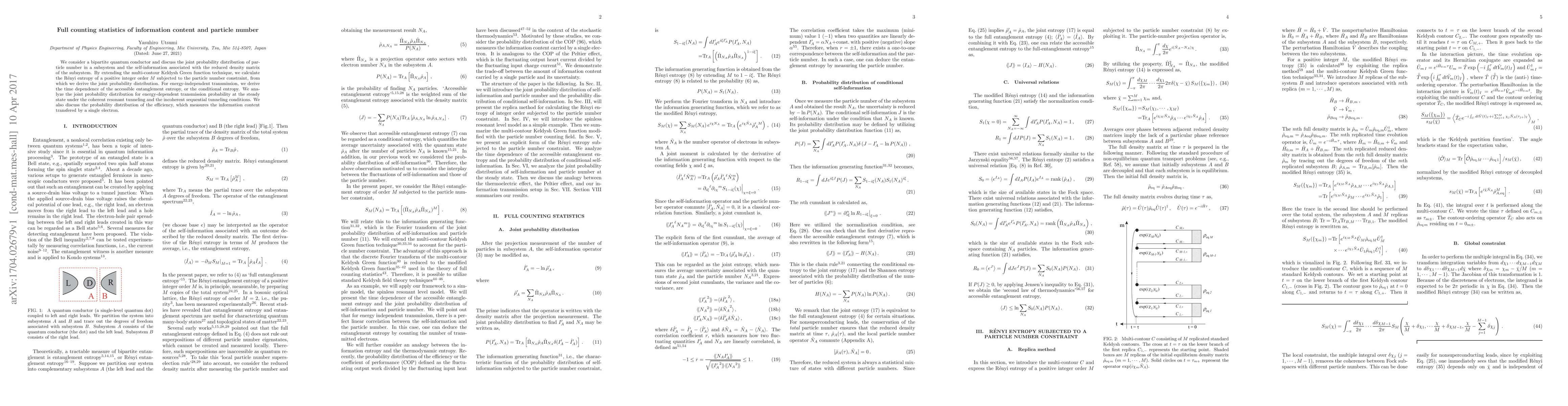 The paper calculates the joint probability distribution of particle number and self-information in a quantum conductor, providing insights into information content transfer and efficiency.