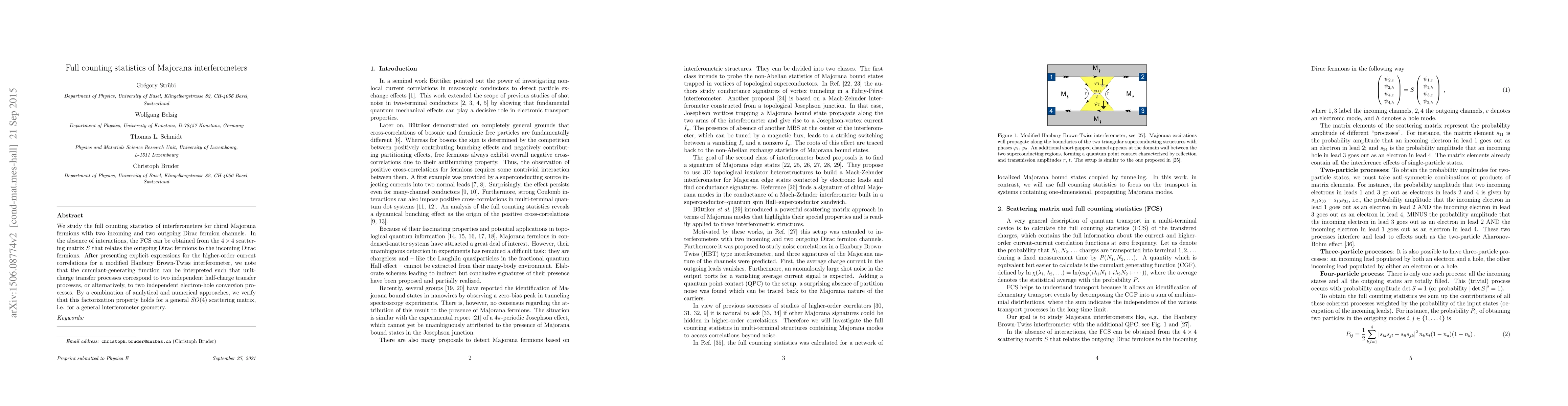 We study the full counting statistics of interferometers for chiral Majorana fermions with two incoming and two outgoing Dirac fermion channels. In the absence of interactions, the FCS can be obtained from the $4\times4$ scattering matrix $S$ that relates the outgoing Dirac fermions to the incoming Dirac fermions. After presenting explicit expressions for the higher-order current correlations for a modified Hanbury Brown-Twiss interferometer, we note that the cumulant-generating function can be interpreted such that unit-charge transfer processes correspond to two independent half-charge transfer processes, or alternatively, to two independent electron-hole conversion processes. By a combination of analytical and numerical approaches, we verify that this factorization property holds for a general $SO(4)$ scattering matrix, i.e. for a general interferometer geometry.