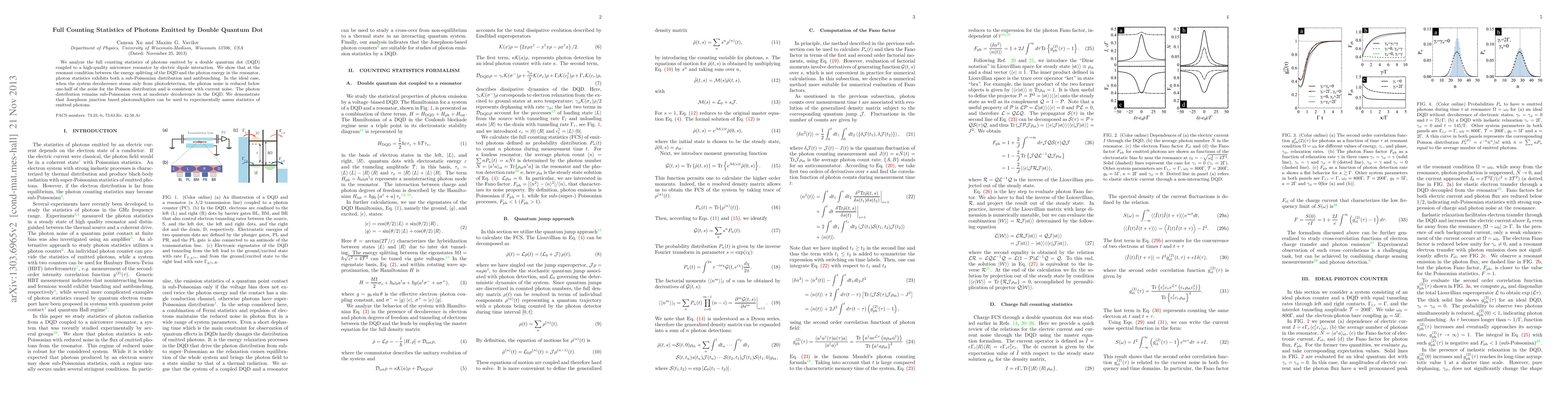 This paper investigates the full counting statistics of photons emitted by a double quantum dot coupled to a resonator, revealing sub-Poissonian photon distributions and antibunching at resonant conditions. Even with moderate decoherence, the photon noise remains below half of the Poisson limit, demonstrating the potential for reduced noise in quantum systems.