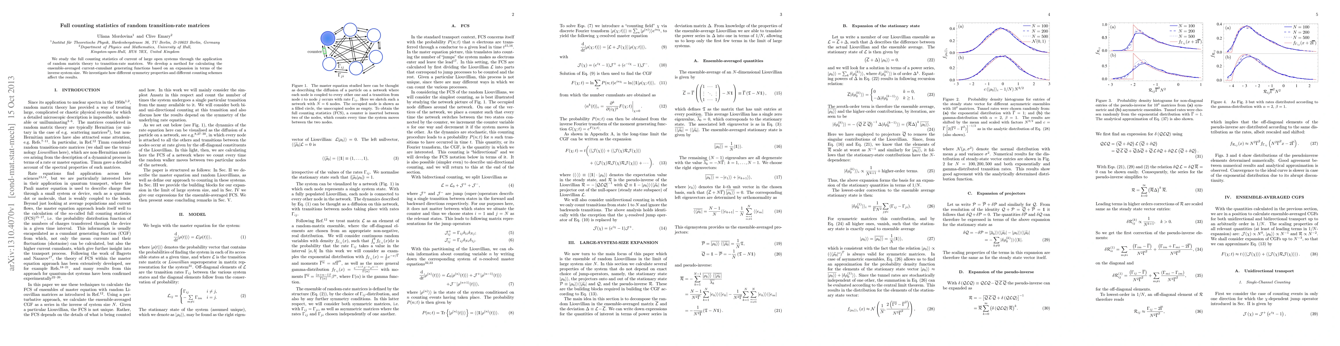 This paper applies random matrix theory to analyze the full counting statistics of current in large open systems using transition-rate matrices. It develops a method for calculating ensemble-averaged current-cumulant generating functions and examines the impact of symmetry properties and counting schemes on the results.
