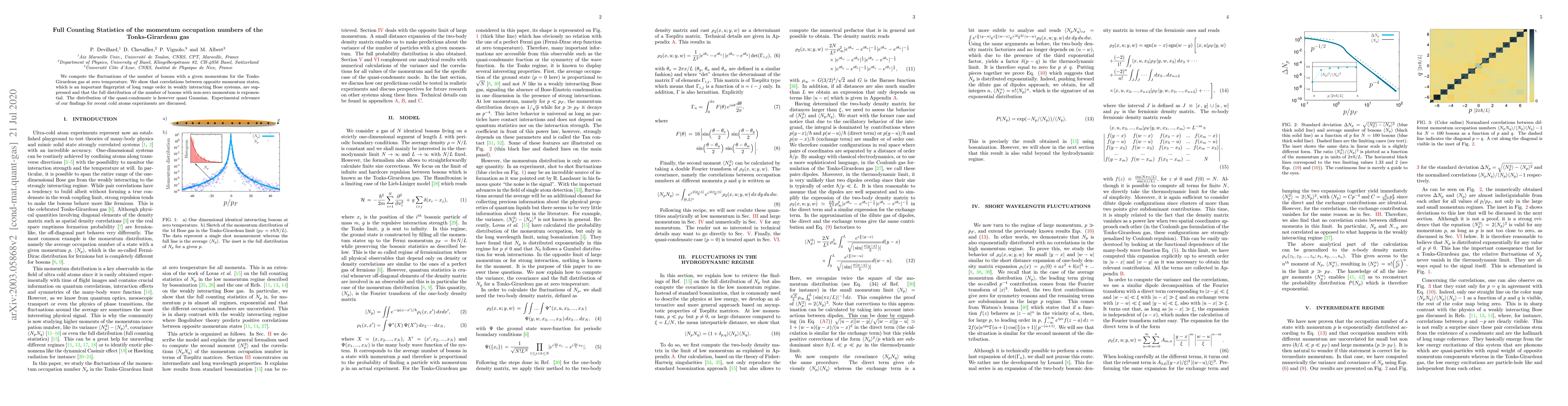 We compute the fluctuations of the number of bosons with a given momentum for the Tonks-Girardeau gas at zero temperature. We show that correlations between opposite momenta, which is an important fingerprint of long range order in weakly interacting Bose systems, are suppressed and that the full distribution of the number of bosons with non zero momentum is exponential. The distribution of the quasi-condensate is however quasi Gaussian. Experimental relevance of our findings for recent cold atoms experiments are discussed.
