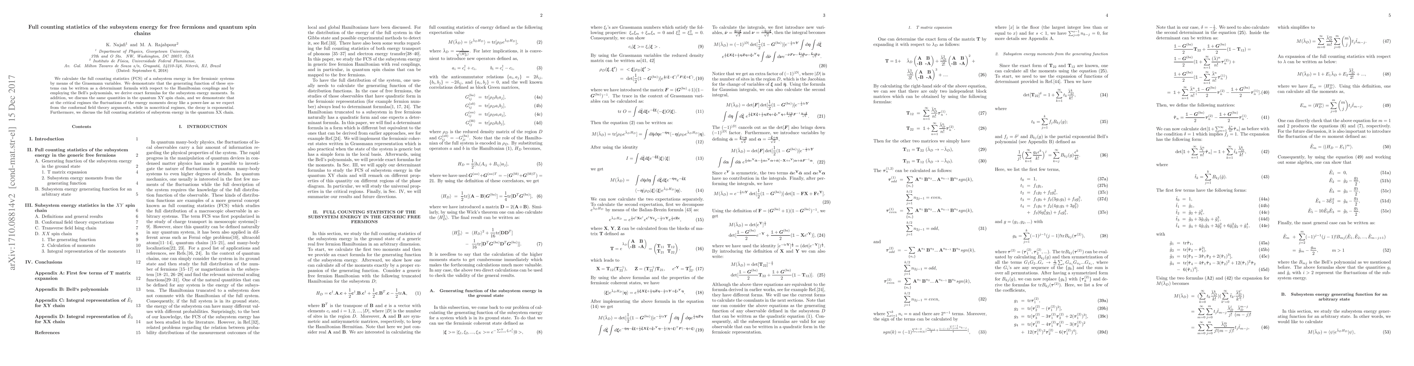 This paper calculates the full counting statistics of subsystem energy in free fermionic systems using Grassmann variables and determinant formulas. It also explores the same statistics in quantum spin chains, showing power-law decay in critical regimes and exponential decay in non-critical regimes.