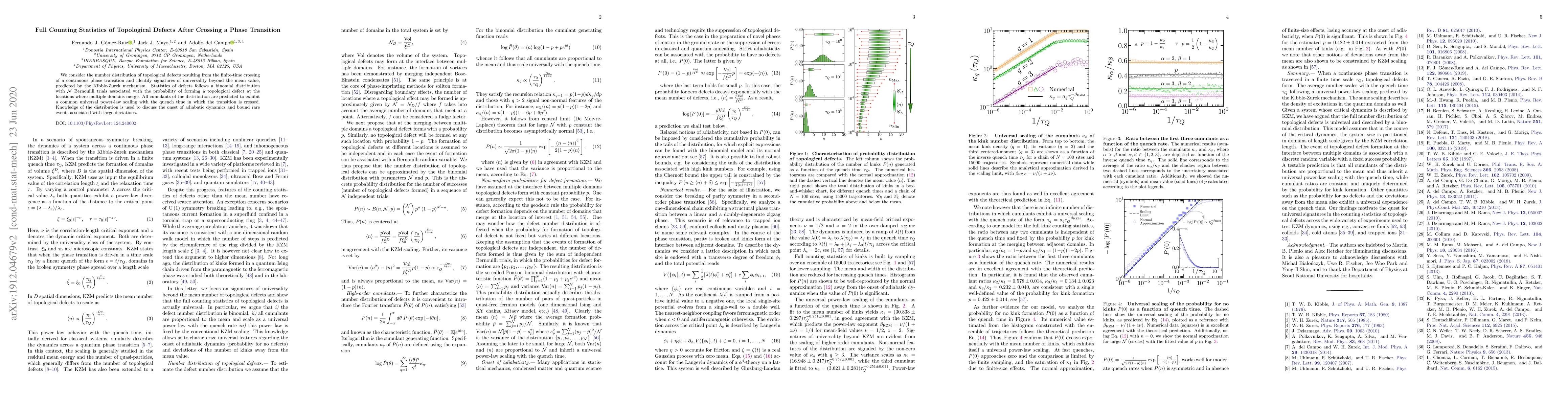 This paper investigates the full counting statistics of topological defects formed during a finite-time phase transition, revealing that defect distributions follow a binomial distribution. It identifies universal power-law scalings in all cumulants of the defect distribution with respect to the quench time, providing insights into adiabatic dynamics and rare events.