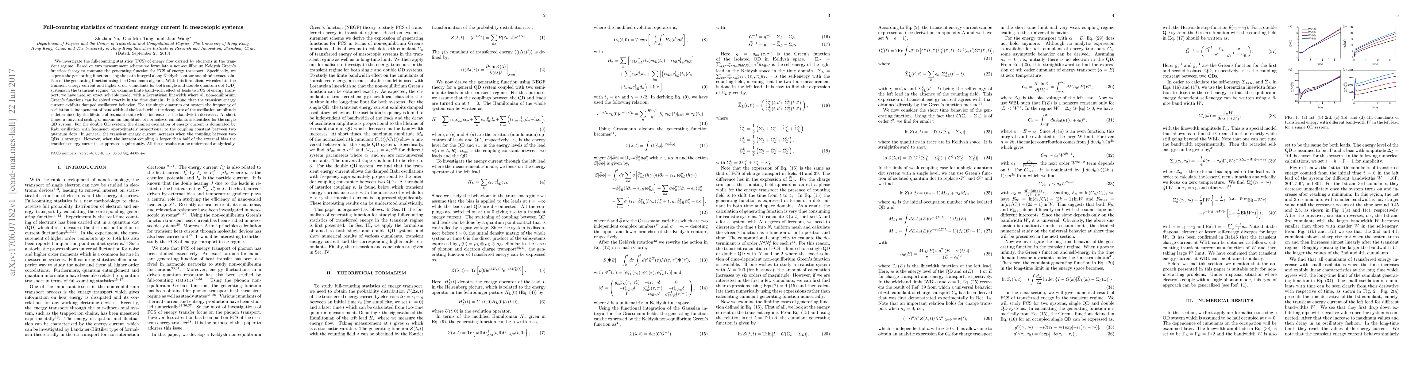 We investigate the full-counting statistics (FCS) of energy flow carried by electrons in the transient regime. Based on two measurement scheme we formulate a non-equilibrium Keldysh Green's function theory to compute the generating function for FCS of energy transport. Specifically, we express the generating function using the path integral along Keldysh contour and obtain exact solution of the generating function using the Grassmann algebra. With this formalism, we calculate the transient energy current and higher order cumulants for both single and double quantum dot (QD) systems in the transient regime. To examine finite bandwidth effect of leads to FCS of energy transport, we have used an exact solvable model with a Lorentizian linewidth where all non-equilibrium Green's functions can be solved exactly in the time domain. It is found that the transient energy current exhibits damped oscillatory behavior. For the single quantum dot system the frequency of oscillation is independent of bandwidth of the leads while the decay rate of the oscillation amplitude is determined by the lifetime of resonant state which increases as the bandwidth decreases. At short times, a universal scaling of maximum amplitude of normalized cumulants is identified for the single QD system. For the double QD system, the damped oscillation of energy current is dominated by Rabi oscillation with frequency approximately proportional to the coupling constant between two quantum dots. In general, the transient energy current increases when the coupling between two QDs is stronger. However, when the interdot coupling is larger than half of the external bias the transient energy current is suppressed significantly. All these results can be understood analytically.