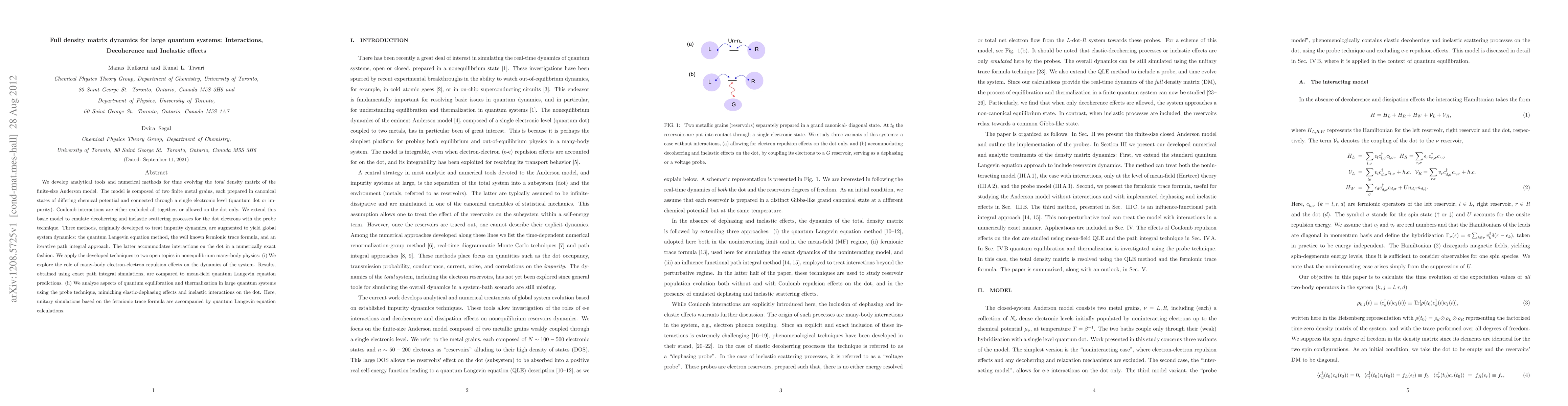 We develop analytical tools and numerical methods for time evolving the total density matrix of the finite-size Anderson model. The model is composed of two finite metal grains, each prepared in canonical states of differing chemical potential and connected through a single electronic level (quantum dot or impurity). Coulomb interactions are either excluded all together, or allowed on the dot only. We extend this basic model to emulate decoherring and inelastic scattering processes for the dot electrons with the probe technique. Three methods, originally developed to treat impurity dynamics, are augmented to yield global system dynamics: the quantum Langevin equation method, the well known fermionic trace formula, and an iterative path integral approach. The latter accommodates interactions on the dot in a numerically exact fashion. We apply the developed techniques to two open topics in nonequilibrium many-body physics: (i) We explore the role of many-body electron-electron repulsion effects on the dynamics of the system. Results, obtained using exact path integral simulations, are compared to mean-field quantum Langevin equation predictions. (ii) We analyze aspects of quantum equilibration and thermalization in large quantum systems using the probe technique, mimicking elastic-dephasing effects and inelastic interactions on the dot. Here, unitary simulations based on the fermionic trace formula are accompanied by quantum Langevin equation calculations.