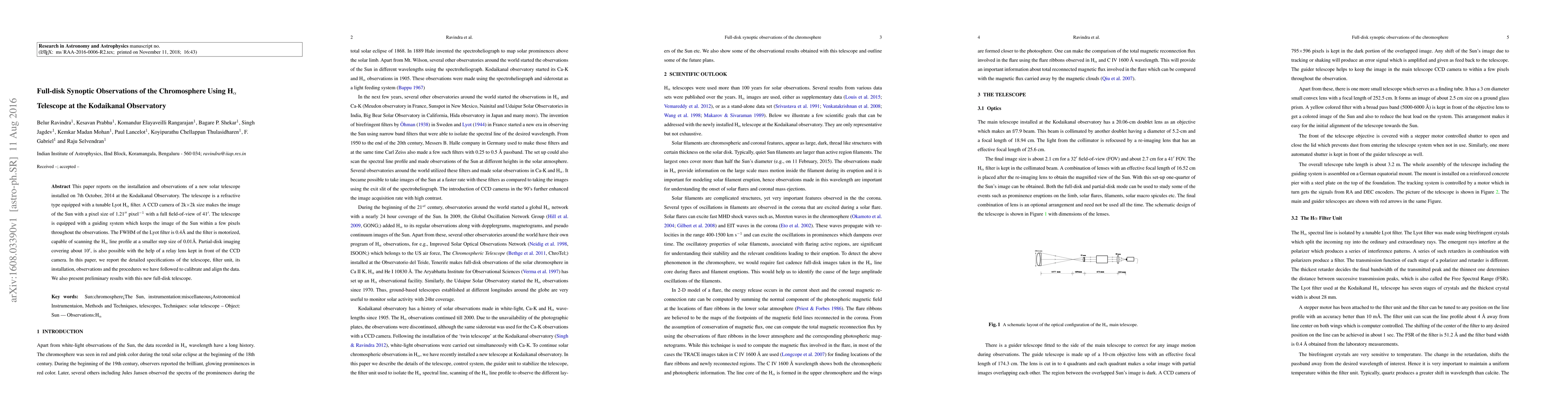 This paper reports on the installation and observations of a new solar telescope installed on 7th October, 2014 at the Kodaikanal Observatory. The telescope is a refractive type equipped with a tunable Lyot H$_{\alpha}$ filter. A CCD camera of 2k$\times$2k size makes the image of the Sun with a pixel size of 1.21$^{\prime\prime}$ pixel$^{-1}$ with a full field-of-view of 41$^{\prime}$. The telescope is equipped with a guiding system which keeps the image of the Sun within a few pixels throughout the observations. The FWHM of the Lyot filter is 0.4\AA~and the filter is motorized, capable of scanning the H$_{\alpha}$ line profile at a smaller step size of 0.01\AA. Partial-disk imaging covering about 10$^{\prime}$, is also possible with the help of a relay lens kept in front of the CCD camera. In this paper, we report the detailed specifications of the telescope, filter unit, its installation, observations and the procedures we have followed to calibrate and align the data. We also present preliminary results with this new full-disk telescope.