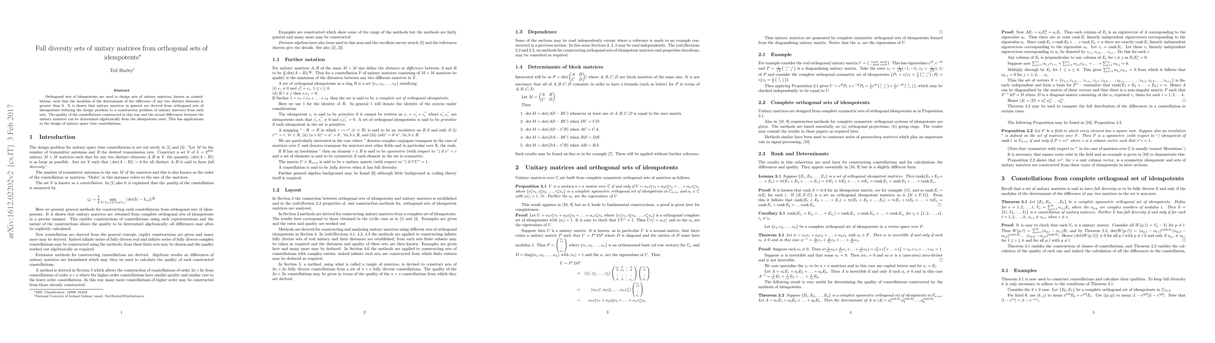 This paper explores the construction of full diversity sets of unitary matrices from orthogonal sets of idempotents, ensuring the modulus of the determinant of the difference between any two distinct matrices is greater than zero. The method simplifies the design problem and has implications for the creation of unitary space-time constellations.