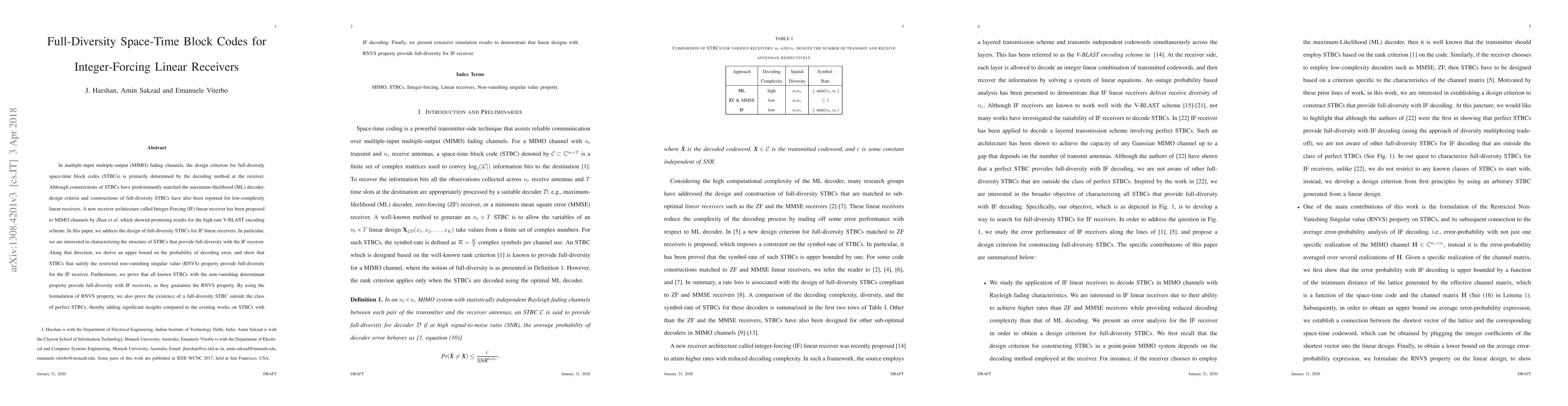 In multiple-input multiple-output (MIMO) fading channels, the design criterion for full-diversity space-time block codes (STBCs) is primarily determined by the decoding method at the receiver. Although constructions of STBCs have predominantly matched the maximum-likelihood (ML) decoder, design criteria and constructions of full-diversity STBCs have also been reported for low-complexity linear receivers. A new receiver architecture called Integer-Forcing (IF) linear receiver has been proposed to MIMO channels by Zhan et al. which showed promising results for the high-rate V-BLAST encoding scheme. In this paper, we address the design of full-diversity STBCs for IF linear receivers. In particular, we are interested in characterizing the structure of STBCs that provide full-diversity with the IF receiver. Along that direction, we derive an upper bound on the probability of decoding error, and show that STBCs that satisfy the restricted non-vanishing singular value (RNVS) property provide full-diversity for the IF receiver. Furthermore, we prove that all known STBCs with the non-vanishing determinant property provide full-diversity with IF receivers, as they guarantee the RNVS property. By using the formulation of RNVS property, we also prove the existence of a full-diversity STBC outside the class of perfect STBCs, thereby adding significant insights compared to the existing works on STBCs with IF decoding. Finally, we present extensive simulation results to demonstrate that linear designs with RNVS property provide full-diversity for IF receiver.