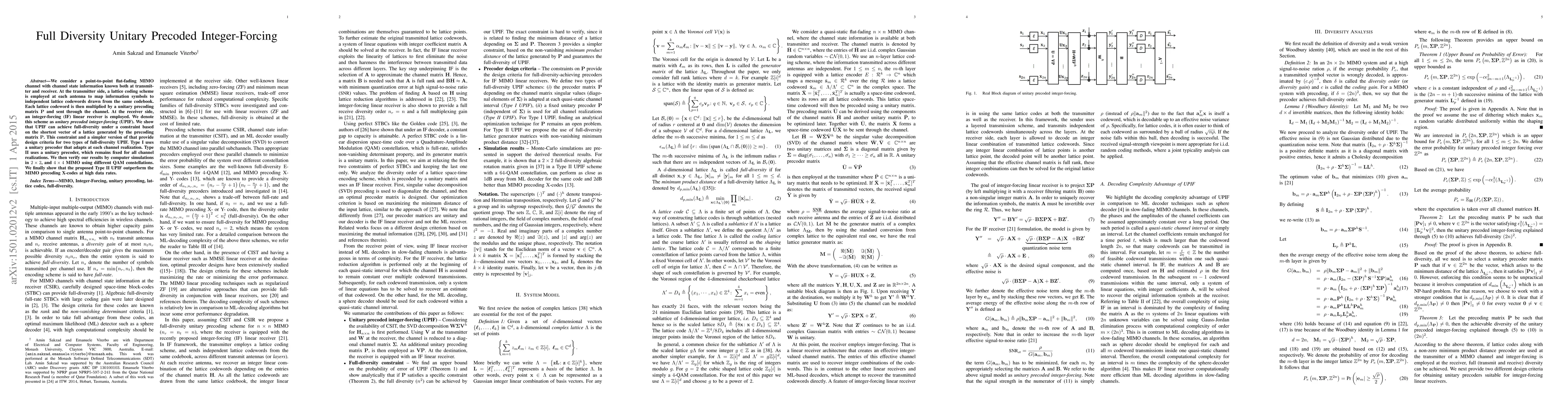 This paper proposes a full diversity unitary precoded integer-forcing (UPIF) scheme for MIMO channels, achieving full diversity through a lattice coding scheme and a linear integer-forcing receiver. The study presents two types of UPIF, with Type II showing superior performance over MIMO precoding X-codes at high data rates.