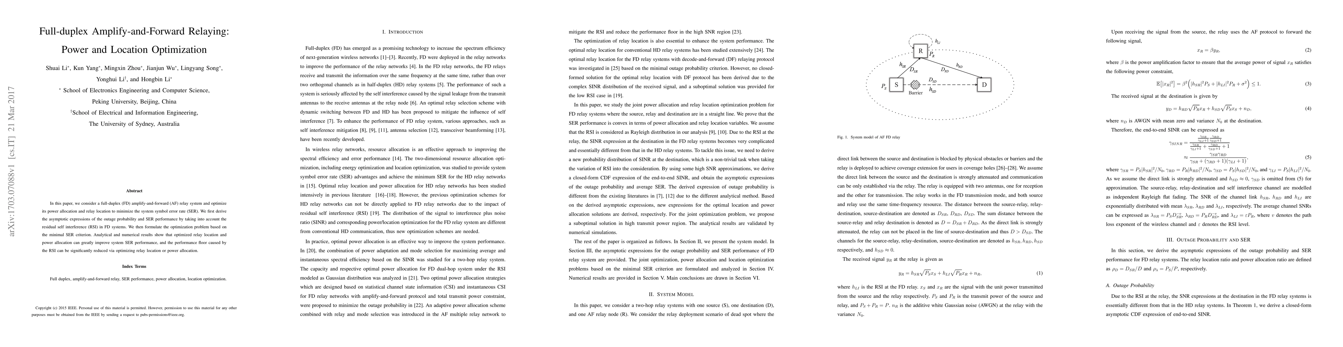 This paper optimizes power allocation and relay location in a full-duplex amplify-and-forward relay system to minimize the symbol error rate (SER). It derives expressions for outage probability and SER, showing that optimized relay placement and power distribution significantly reduce the SER and mitigate the effects of residual self-interference.