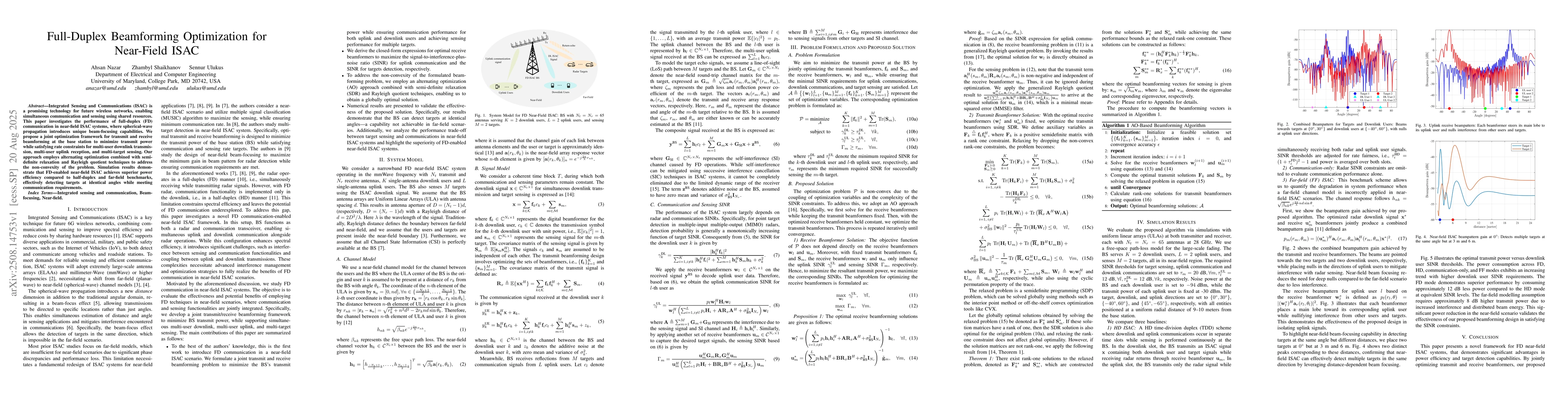 The paper introduces an optimization-based beamforming design for FD near-field ISAC systems, leveraging alternating optimization, semidefinite relaxation, and Rayleigh quotient techniques to jointly optimize transmit and receive beamformers while satisfying SINR constraints for both communication and sensing.
