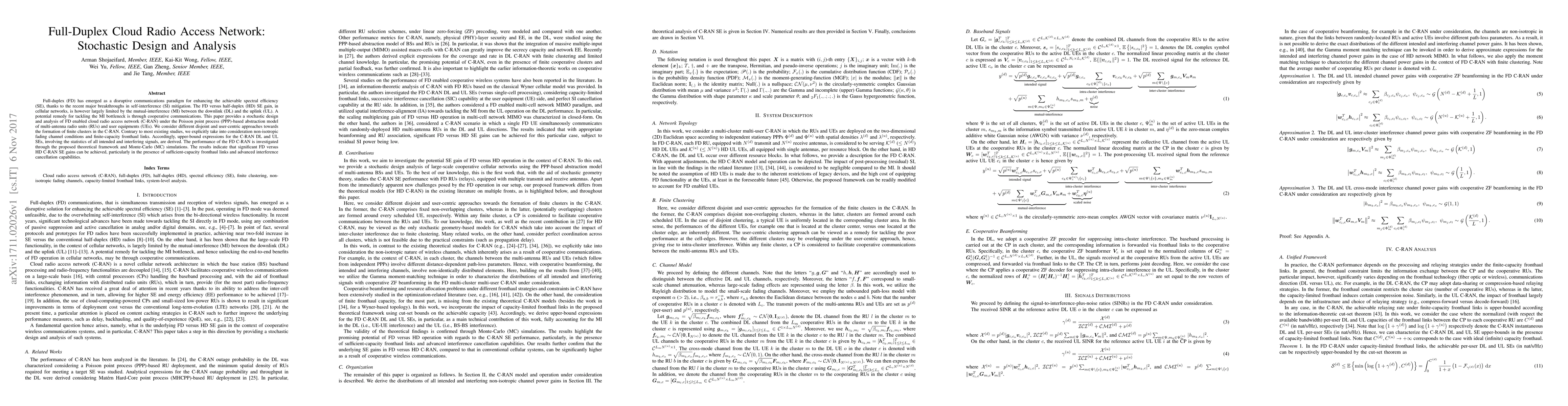 Full-duplex (FD) has emerged as a disruptive communications paradigm for enhancing the achievable spectral efficiency (SE), thanks to the recent major breakthroughs in self-interference (SI) mitigation. The FD versus half-duplex (HD) SE gain, in cellular networks, is however largely limited by the mutual-interference (MI) between the downlink (DL) and the uplink (UL). A potential remedy for tackling the MI bottleneck is through cooperative communications. This paper provides a stochastic design and analysis of FD enabled cloud radio access network (C-RAN) under the Poisson point process (PPP)-based abstraction model of multi-antenna radio units (RUs) and user equipments (UEs). We consider different disjoint and user-centric approaches towards the formation of finite clusters in the C-RAN. Contrary to most existing studies, we explicitly take into consideration non-isotropic fading channel conditions and finite-capacity fronthaul links. Accordingly, upper-bound expressions for the C-RAN DL and UL SEs, involving the statistics of all intended and interfering signals, are derived. The performance of the FD C-RAN is investigated through the proposed theoretical framework and Monte-Carlo (MC) simulations. The results indicate that significant FD versus HD C-RAN SE gains can be achieved, particularly in the presence of sufficient-capacity fronthaul links and advanced interference cancellation capabilities.