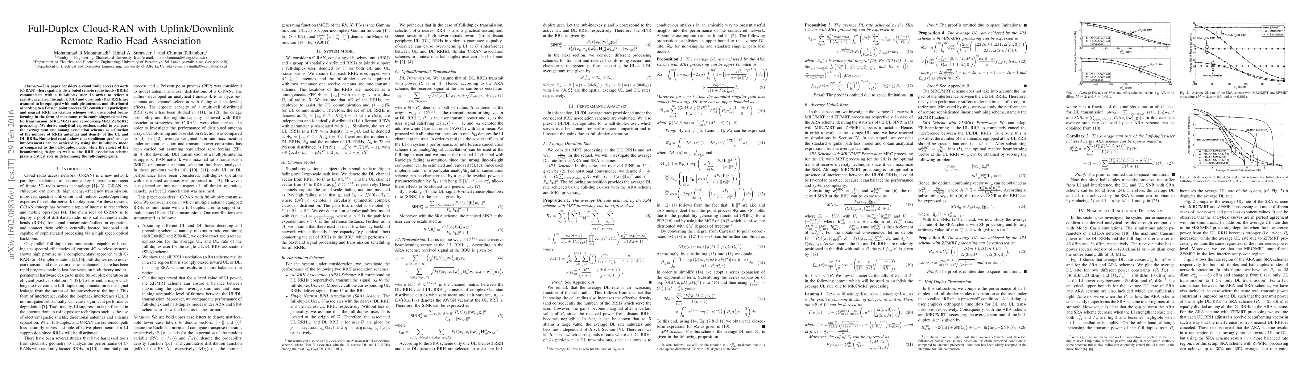 This paper investigates full-duplex cloud radio access networks (C-RAN) with spatially distributed remote radio heads (RRHs) and explores the impact of uplink/downlink RRH association schemes on performance. The study finds that full-duplex mode significantly enhances sum rate compared to half-duplex, with beamforming design and RRH association critically influencing these gains.