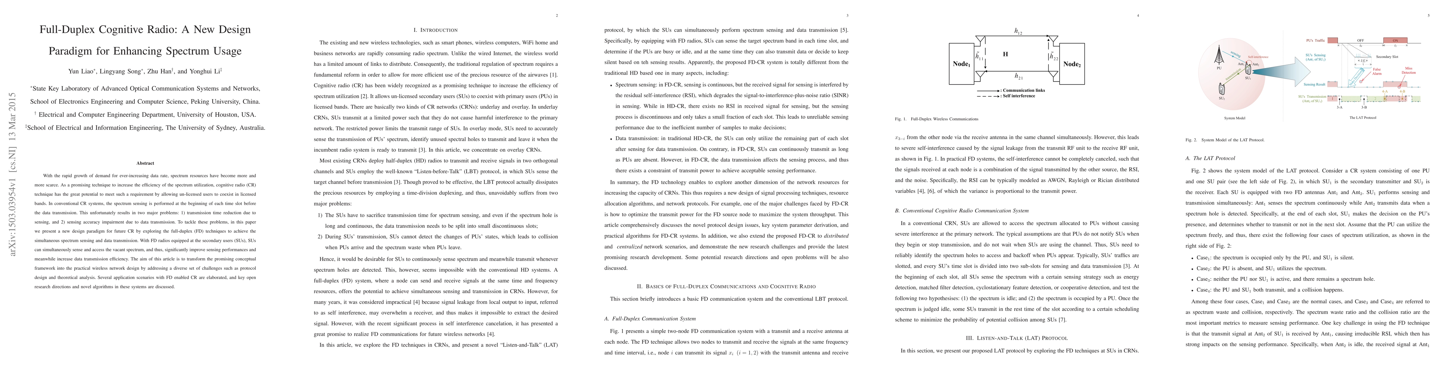 With the rapid growth of demand for ever-increasing data rate, spectrum resources have become more and more scarce. As a promising technique to increase the efficiency of the spectrum utilization, cognitive radio (CR) technique has the great potential to meet such a requirement by allowing un-licensed users to coexist in licensed bands. In conventional CR systems, the spectrum sensing is performed at the beginning of each time slot before the data transmission. This unfortunately results in two major problems: 1) transmission time reduction due to sensing, and 2) sensing accuracy impairment due to data transmission. To tackle these problems, in this paper we present a new design paradigm for future CR by exploring the full-duplex (FD) techniques to achieve the simultaneous spectrum sensing and data transmission. With FD radios equipped at the secondary users (SUs), SUs can simultaneously sense and access the vacant spectrum, and thus, significantly improve sensing performances and meanwhile increase data transmission efficiency. The aim of this article is to transform the promising conceptual framework into the practical wireless network design by addressing a diverse set of challenges such as protocol design and theoretical analysis. Several application scenarios with FD enabled CR are elaborated, and key open research directions and novel algorithms in these systems are discussed.