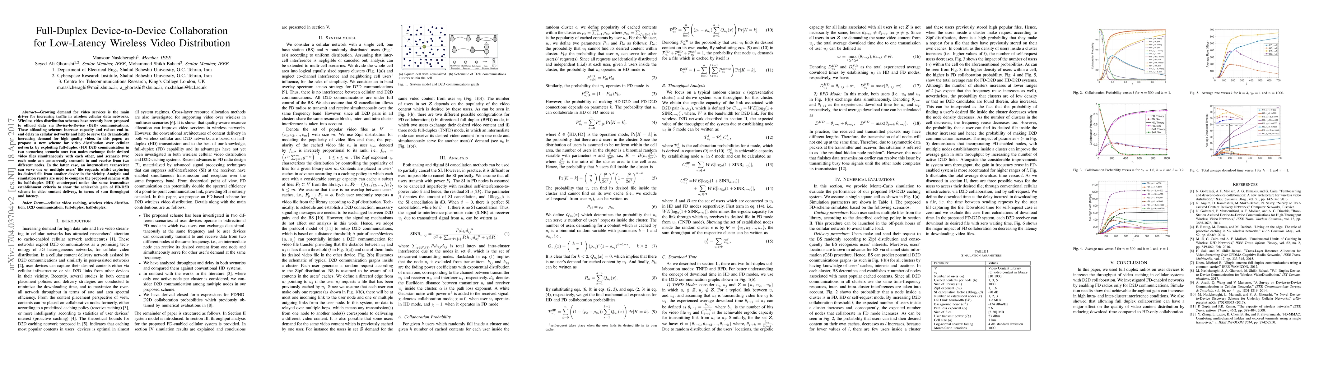 This paper proposes a full-duplex Device-to-Device (D2D) communication scheme for low-latency wireless video distribution, comparing it with half-duplex methods. The scheme enables simultaneous video file exchange and reduces end-to-end delay, demonstrating improved sum throughput and lower latency.
