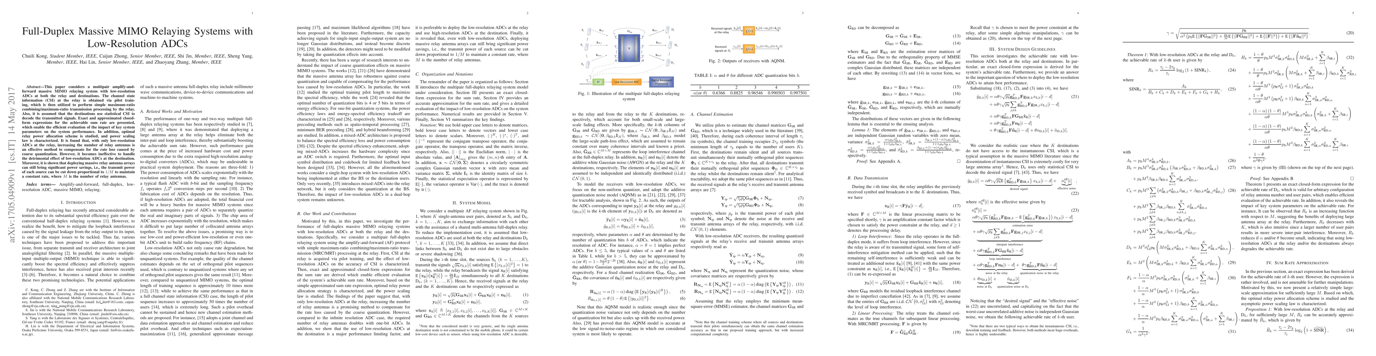 This paper investigates a multipair massive MIMO relaying system with low-resolution ADCs, focusing on achievable sum rate and optimal relay power allocation. It finds that increasing the number of relay antennas can compensate for rate loss due to coarse quantization but not at the destination, and massive relay arrays can significantly reduce source transmit power.