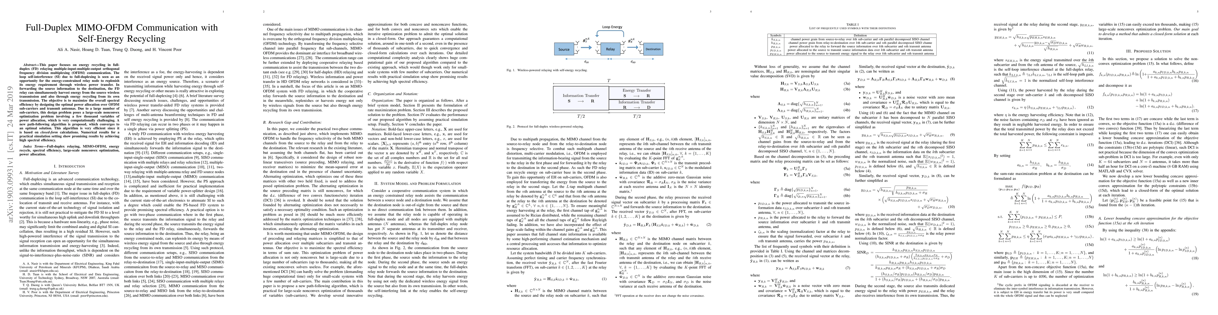 This paper explores energy recycling in full-duplex MIMO-OFDM relaying to maximize spectral efficiency. A new path-following algorithm based on closed-form calculations is proposed to solve the large-scale nonconvex optimization problem, achieving optimal power allocation and high spectral efficiency.