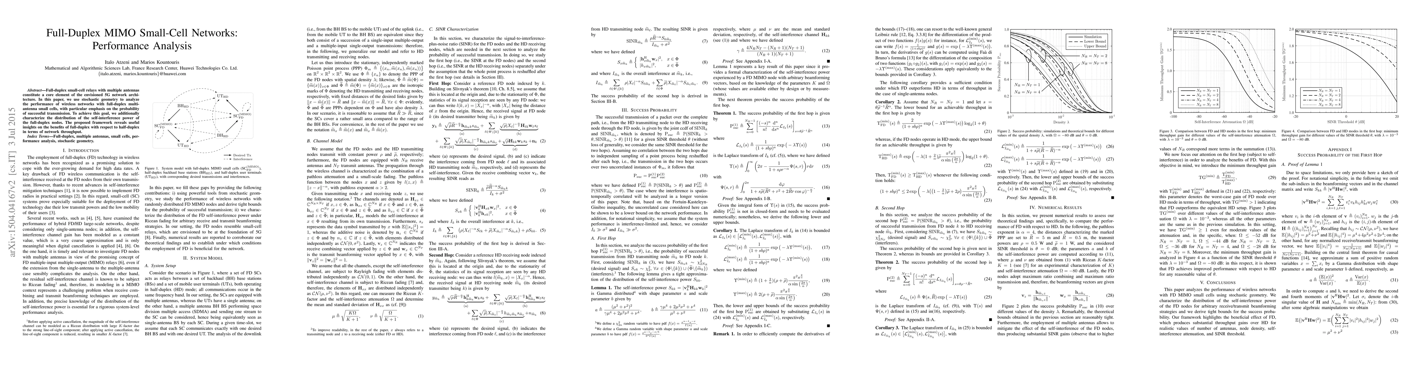 This paper employs stochastic geometry to analyze the performance of full-duplex MIMO small-cell networks, focusing on the probability of successful transmission and self-interference power distribution. The study reveals that full-duplex technology can enhance network throughput compared to half-duplex systems.