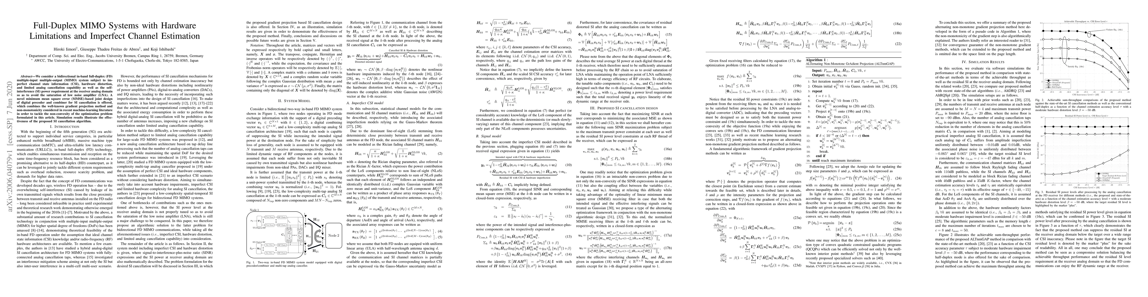 This paper proposes a new algorithm to minimize errors in full-duplex MIMO systems with imperfect channel estimation, hardware distortion, and self-interference. It successfully cancels interference using a joint digital precoder and combiner design, improving system performance.