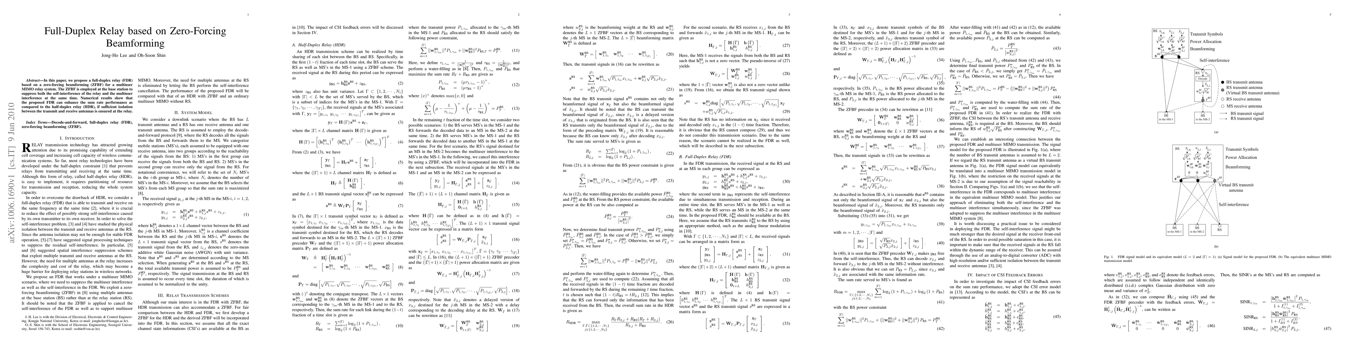This paper proposes a full-duplex relay system using zero-forcing beamforming to suppress self-interference and multiuser interference. The results indicate improved sum rate performance compared to half-duplex relays, provided sufficient antenna isolation is achieved.