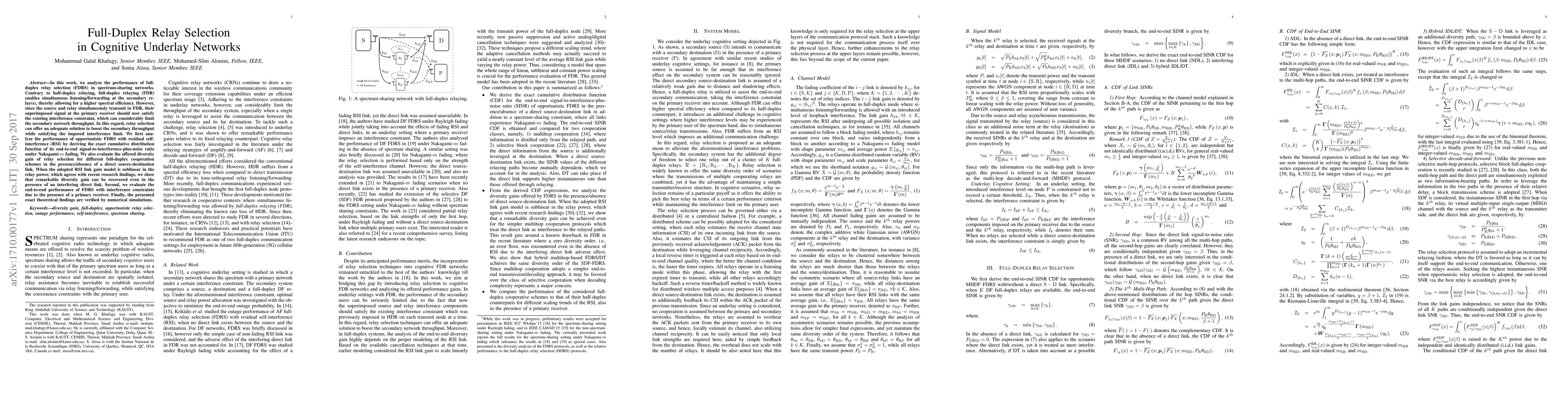 This paper analyzes the performance of full-duplex relay selection (FDRS) in cognitive underlay networks, focusing on how it can enhance spectral efficiency while managing interference to primary receivers. It derives the exact cumulative distribution function for end-to-end signal-to-interference-plus-noise ratio under Nakagami-m fading and evaluates diversity gain in different relay selection schemes.