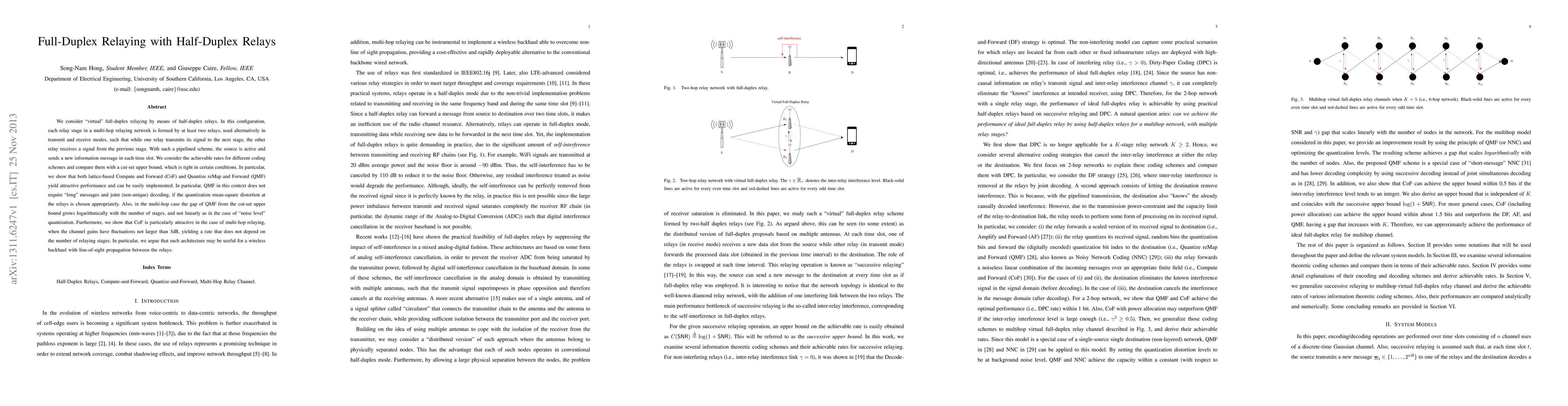 This paper explores "virtual" full-duplex relaying using half-duplex relays in multi-hop networks, where each relay stage alternates between transmit and receive modes. It evaluates achievable rates for different coding schemes, showing that Compute and Forward and Quantize reMap and Forward methods offer attractive performance, especially in multi-hop scenarios where CoF is effective for stable channel conditions.