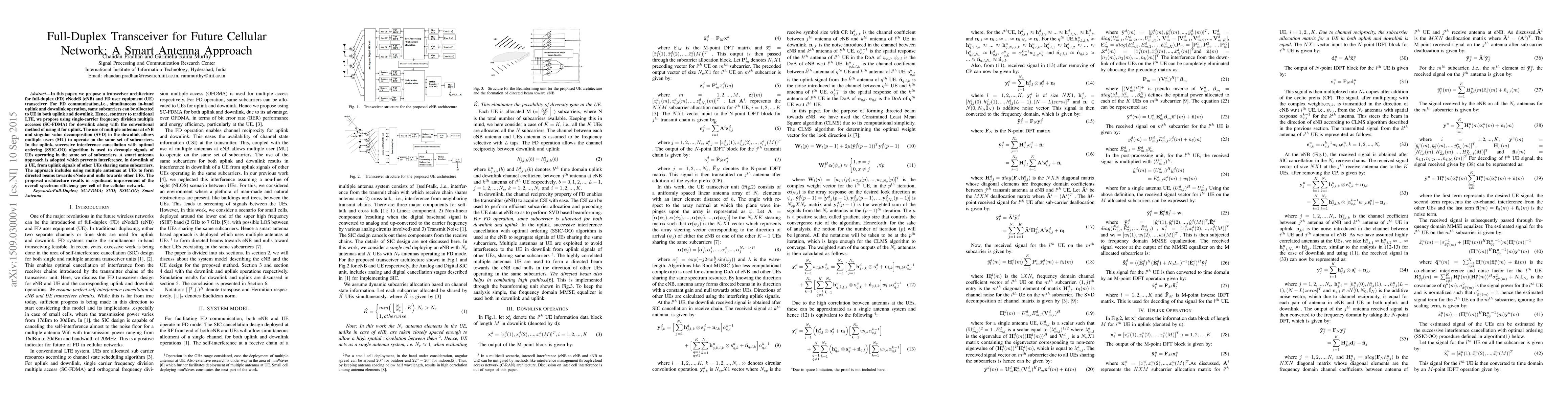 The paper proposes a full-duplex (FD) transceiver architecture for eNodeB (eNB) and user equipment (UE) using single-carrier frequency division multiple access (SC-FDMA) for both uplink and downlink, enabling simultaneous in-band operation. Multiple antennas and singular value decomposition (SVD) are employed for multiple-user (MU) operation on the same subcarriers. Successive interference cancellation with optimal ordering (SSIC-OO) is used in the uplink to decouple signals, while a smart antenna approach prevents interference in the downlink.