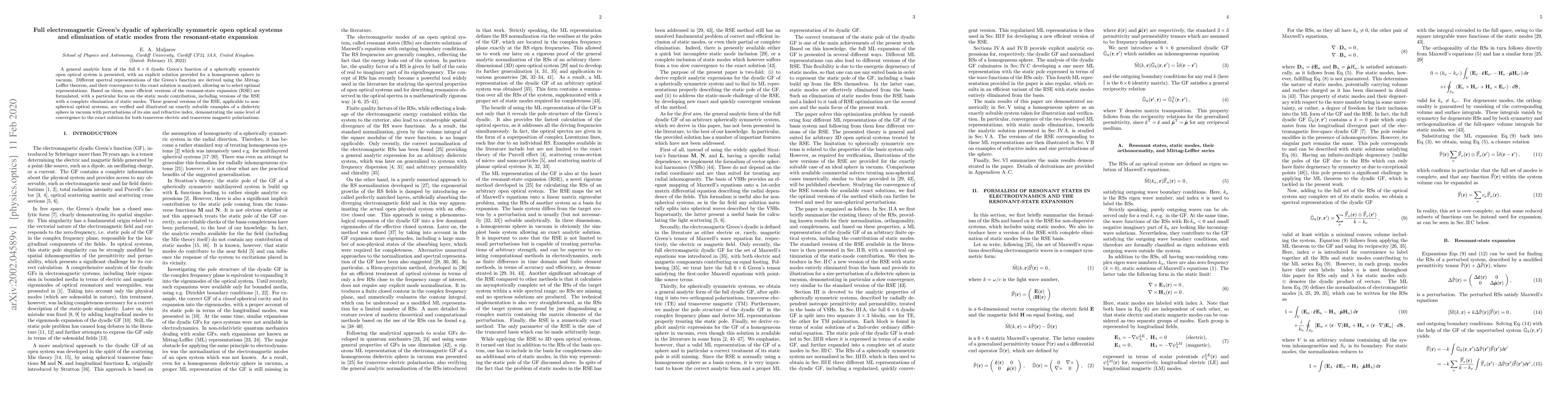 A general analytic form of the full 6x6 dyadic Green's function of a spherically symmetric open optical system is presented, with an explicit solution provided for a homogeneous sphere in vacuum. Different spectral representations of the Green's function are derived using the Mittag-Leffler theorem, and their convergence to the exact solution is analyzed, allowing us to select optimal representations. Based on them, more efficient versions of the resonant-state expansion (RSE) are formulated, with a particular focus on the static mode contribution, including versions of the RSE with a complete elimination of static modes. These general versions of the RSE, applicable to non-spherical optical systems, are verified and illustrated on exactly solvable examples of a dielectric sphere in vacuum with perturbations of its size and refractive index, demonstrating the same level of convergence to the exact solution for both transverse electric and transverse magnetic polarizations.