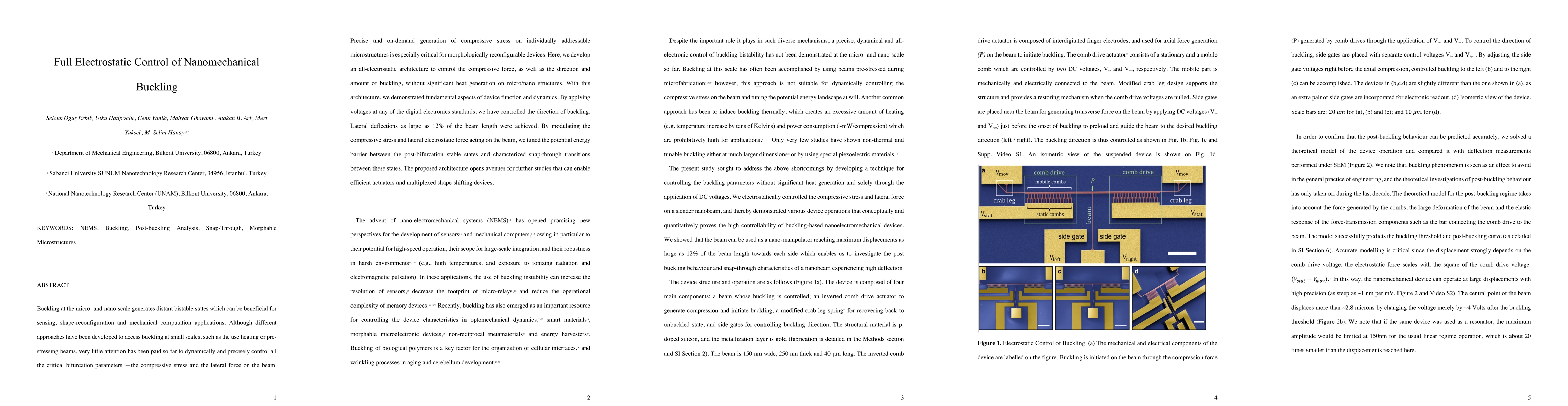 Buckling at the micro and nanoscale generates distant bistable states which can be beneficial for sensing, shape-reconfiguration and mechanical computation applications. Although different approaches have been developed to access buckling at small scales, such as the use heating or pre-stressing beams, very little attention has been paid so far to dynamically and precisely control all the critical bifurcation parameters, the compressive stress and the lateral force on the beam. Precise and on-demand generation of compressive stress on individually addressable microstructures is especially critical for morphologically reconfigurable devices. Here, we develop an all-electrostatic architecture to control the compressive force, as well as the direction and amount of buckling, without significant heat generation on micro/nano structures. With this architecture, we demonstrated fundamental aspects of device function and dynamics. By applying voltages at any of the digital electronics standards, we have controlled the direction of buckling. Lateral deflections as large as 12% of the beam length were achieved. By modulating the compressive stress and lateral electrostatic force acting on the beam, we tuned the potential energy barrier between the post-bifurcation stable states and characterized snap-through transitions between these states. The proposed architecture opens avenues for further studies that can enable efficient actuators and multiplexed shape-shifting devices.