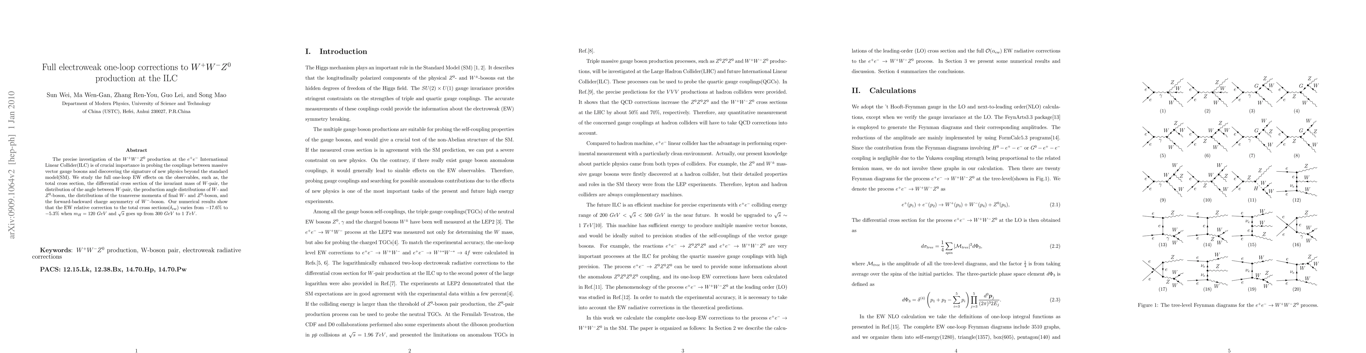 This paper investigates full electroweak one-loop corrections to $W^+ W^-Z^0$ production at the International Linear Collider (ILC), focusing on various observables to probe gauge boson couplings and potential new physics. The study finds significant electroweak relative corrections to total cross sections, ranging from -18.9% to -5.7% over a range of collision energies.