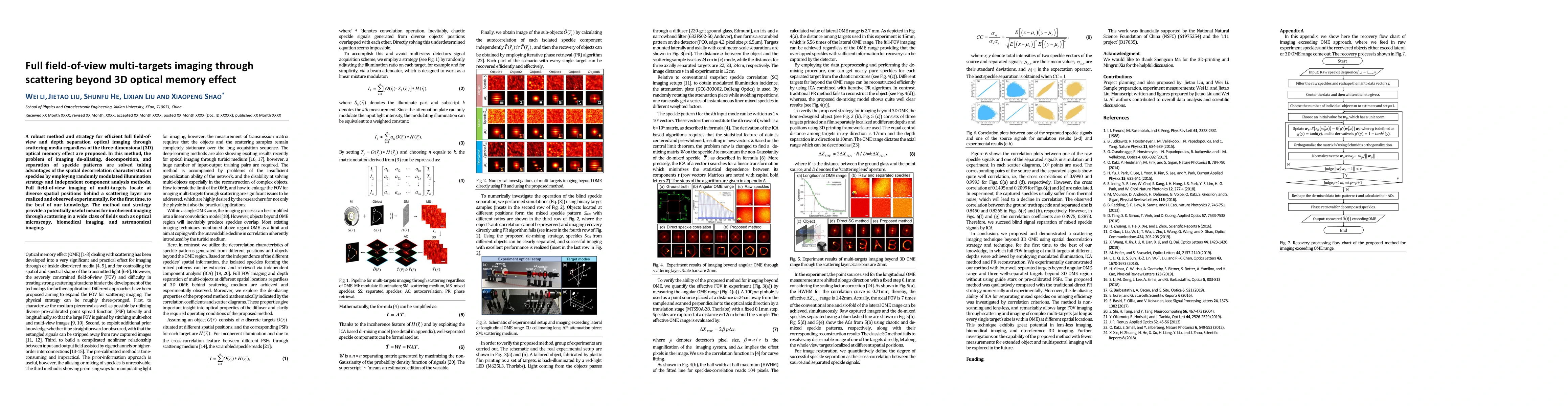This paper proposes a robust method for full field-of-view and depth separation optical imaging through scattering media, overcoming the 3D optical memory effect. It utilizes randomly modulated illumination and independent component analysis to achieve clear imaging of multiple targets behind scattering layers.