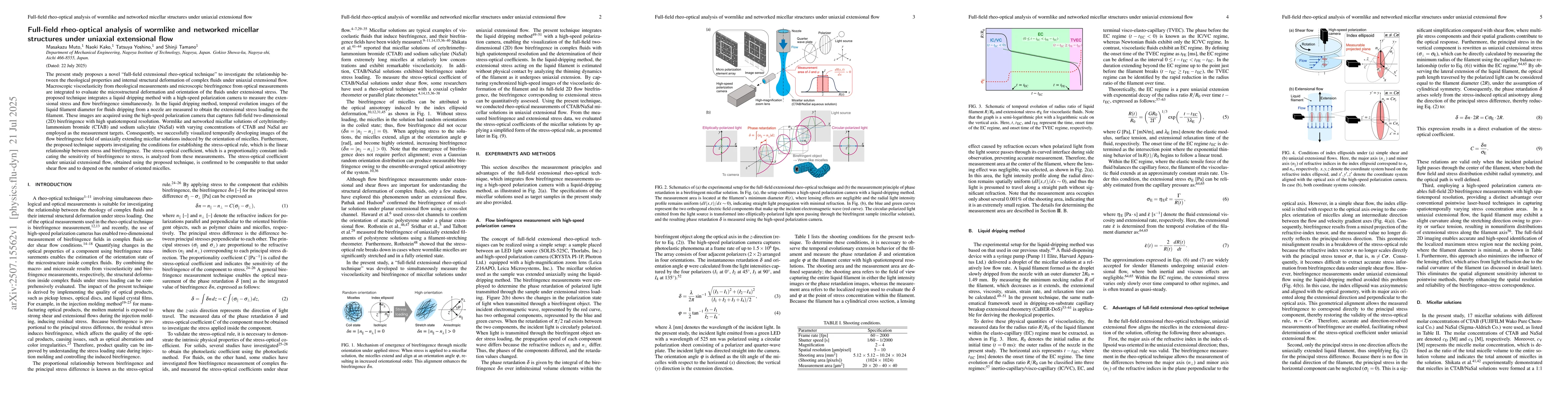 The present study proposes a novel full-field extensional rheo-optical technique to investigate the relationship between the rheological properties and internal structural deformation of complex fluids under uniaxial extensional flow. Macroscopic viscoelasticity from rheological measurements and microscopic birefringence from optical measurements are integrated to evaluate the microstructural deformation and orientation of the fluids under extensional stress. The proposed technique integrates a liquid dripping method with a high-speed polarization camera to measure the extensional stress and flow birefringence simultaneously. In the liquid dripping method, temporal evolution images of the liquid filament diameter for fluids dripping from a nozzle are measured to obtain the extensional stress loading on the filament. These images are acquired using the high-speed polarization camera that captures full-field two-dimensional (2D) birefringence with high spatiotemporal resolution. Wormlike and networked micellar solutions of cetyltrimethylammonium bromide (CTAB) and sodium salicylate (NaSal) with varying concentrations of CTAB and NaSal are employed as the measurement targets. Consequently, we successfully visualized temporally developing images of the flow birefringence field of uniaxially extending micellar solutions induced by the orientation of micelles. Furthermore, the proposed technique supports investigating the conditions for establishing the stress-optical rule, which is the linear relationship between stress and birefringence. The stress-optical coefficient, which is a proportionality constant indicating the sensitivity of birefringence to stress, is analyzed from these measurements. The stress-optical coefficient under uniaxial extensional flow, obtained using the proposed technique, is confirmed to be comparable to that under shear flow.