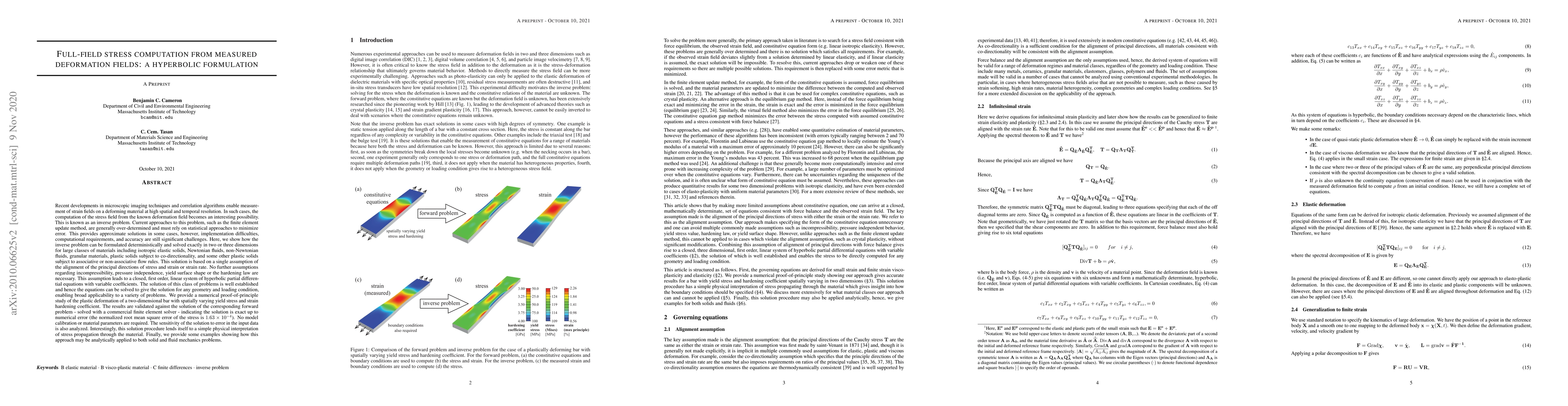 Recent developments in imaging techniques and correlation algorithms enable measurement of strain fields on a deforming material at high spatial and temporal resolution. In such cases, the computation of the stress field from the known deformation field becomes an interesting possibility. This is known as an inverse problem. Current approaches to this problem, such as the finite element update method, are generally over-determined and must rely on statistical approaches to minimize error. This provides approximate solutions in some cases, however, implementation difficulties, computational requirements, and accuracy are still significant challenges. Here, we show how the inverse problem can be formulated deterministically and solved exactly in two or three dimensions for large classes of materials including isotropic elastic solids, Newtonian fluids, non-Newtonian fluids, granular materials and isotropic plastic solids. This solution is based on a single assumption of the alignment of the principal directions of stress and strain or strain rate. No further assumptions regarding incompressibility, pressure independence, yield surface shape or the hardening law are necessary. This assumption leads to a closed, first order, linear system of hyperbolic partial differential equations with variable coefficients and can be solved to give the solution for any geometry and loading condition. We provide a numerical proof-of-principle study of the plastic deformation of a two-dimensional bar with spatially varying yield stress and strain hardening coefficient. The results are validated indicating the solution is exact up to numerical error. No model calibration or material parameters are required. Interestingly, this solution procedure lends itself to a simple physical interpretation of stress propagation through the material.
