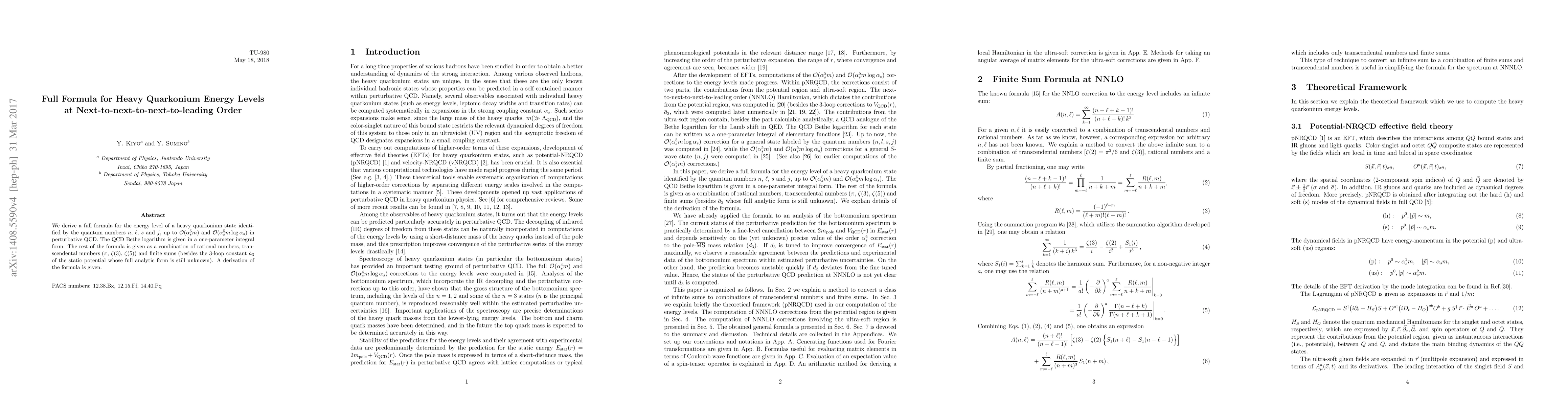 We derive a full formula for the energy level of a heavy quarkonium state identified by the quantum numbers $n$, $\ell$, $s$ and $j$, up to ${\cal O}(\alpha_s^5 m)$ and ${\cal O}(\alpha_s^5 m \log \alpha_s)$ in perturbative QCD. The QCD Bethe logarithm is given in a one-parameter integral form. The rest of the formula is given as a combination of rational numbers, transcendental numbers ($\pi$, $\zeta(3)$, $\zeta(5)$) and finite sums (besides the 3-loop constant $\bar{a}_3$ of the static potential whose full analytic form is still unknown). A derivation of the formula is given.