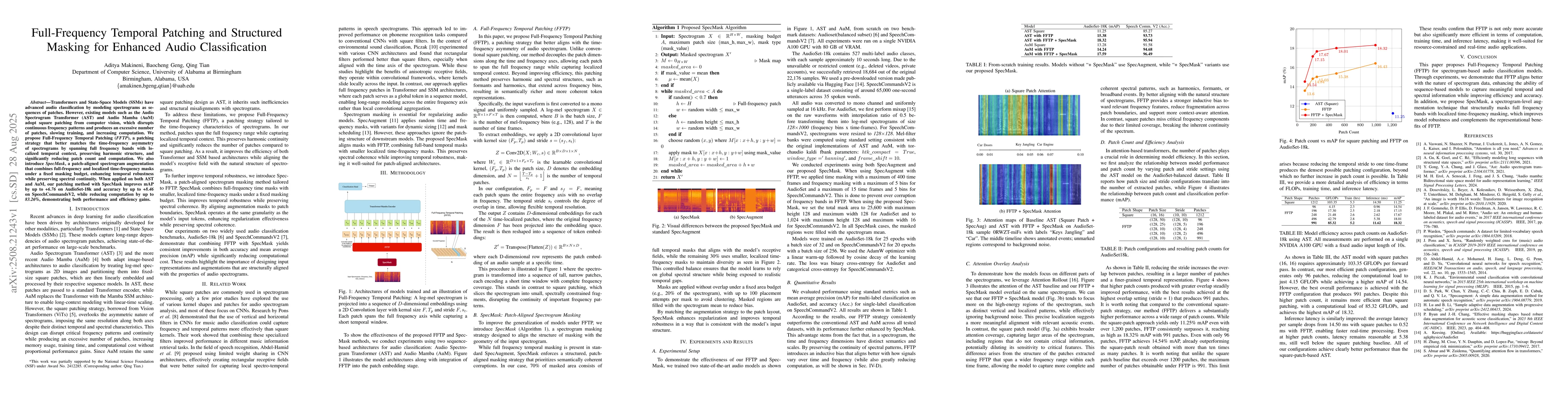 Transformers and State-Space Models (SSMs) have advanced audio classification by modeling spectrograms as sequences of patches. However, existing models such as the Audio Spectrogram Transformer (AST) and Audio Mamba (AuM) adopt square patching from computer vision, which disrupts continuous frequency patterns and produces an excessive number of patches, slowing training, and increasing computation. We propose Full-Frequency Temporal Patching (FFTP), a patching strategy that better matches the time-frequency asymmetry of spectrograms by spanning full frequency bands with localized temporal context, preserving harmonic structure, and significantly reducing patch count and computation. We also introduce SpecMask, a patch-aligned spectrogram augmentation that combines full-frequency and localized time-frequency masks under a fixed masking budget, enhancing temporal robustness while preserving spectral continuity. When applied on both AST and AuM, our patching method with SpecMask improves mAP by up to +6.76 on AudioSet-18k and accuracy by up to +8.46 on SpeechCommandsV2, while reducing computation by up to 83.26%, demonstrating both performance and efficiency gains.