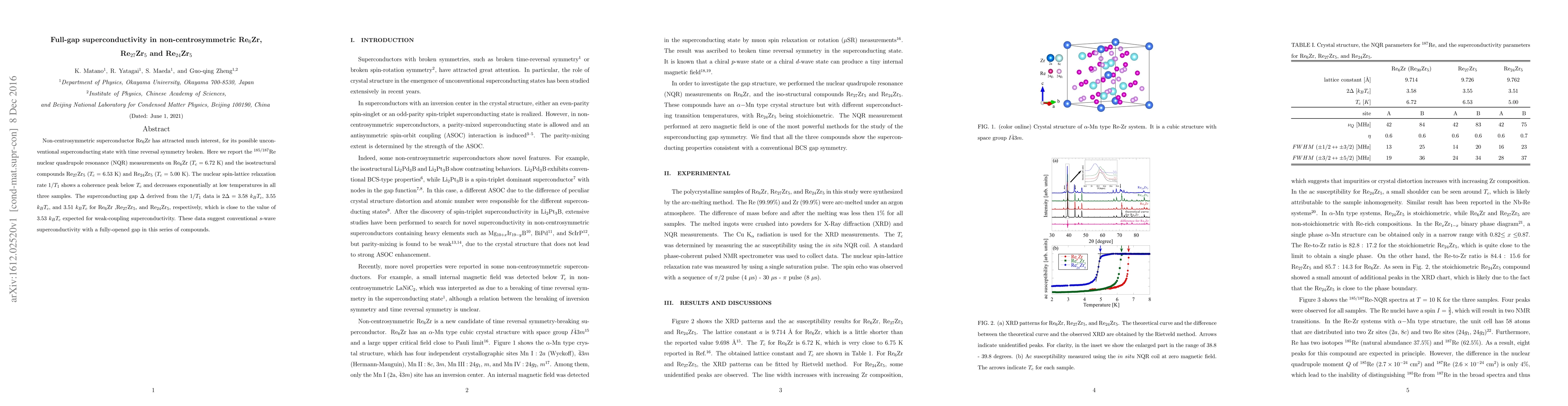 This study reports full-gap superconductivity in non-centrosymmetric Re$_6$Zr, Re$_{27}$Zr$_{5}$, and Re$_{24}$Zr$_{5}$ compounds, with nuclear quadrupole resonance measurements revealing coherence peaks and conventional $s$-wave superconductivity characterized by a fully-opened gap.