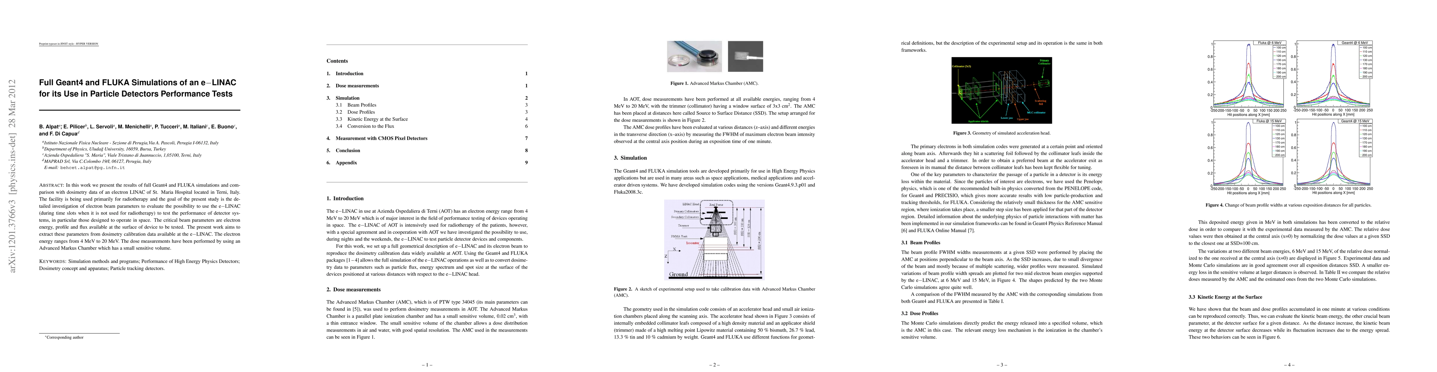 In this work we present the results of full Geant4 and FLUKA simulations and comparison with dosimetry data of an electron LINAC of St. Maria Hospital located in Terni, Italy. The facility is being used primarily for radiotherapy and the goal of present study is the detailed investigation of electron beam parameters to evaluate the possibility to use the e-LINAC (during time slots when it is not used for radiotherapy) to test the performance of detector systems in particular those designed to operate in space. The critical beam parameters are electron energy, profile and flux available at the surface of device to be tested. The present work aims to extract these parameters from dosimetry calibration data available at the e-LINAC. The electron energy ranges is from 4 MeV to 20 MeV. The dose measurements have been performed by using an Advanced Markus Chamber which has a small sensitive volume.