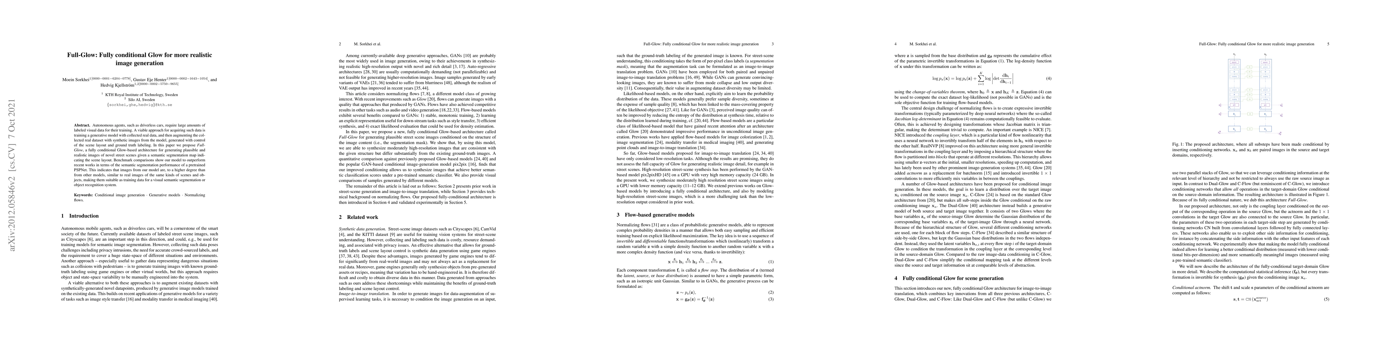 Autonomous agents, such as driverless cars, require large amounts of labeled visual data for their training. A viable approach for acquiring such data is training a generative model with collected real data, and then augmenting the collected real dataset with synthetic images from the model, generated with control of the scene layout and ground truth labeling. In this paper we propose Full-Glow, a fully conditional Glow-based architecture for generating plausible and realistic images of novel street scenes given a semantic segmentation map indicating the scene layout. Benchmark comparisons show our model to outperform recent works in terms of the semantic segmentation performance of a pretrained PSPNet. This indicates that images from our model are, to a higher degree than from other models, similar to real images of the same kinds of scenes and objects, making them suitable as training data for a visual semantic segmentation or object recognition system.