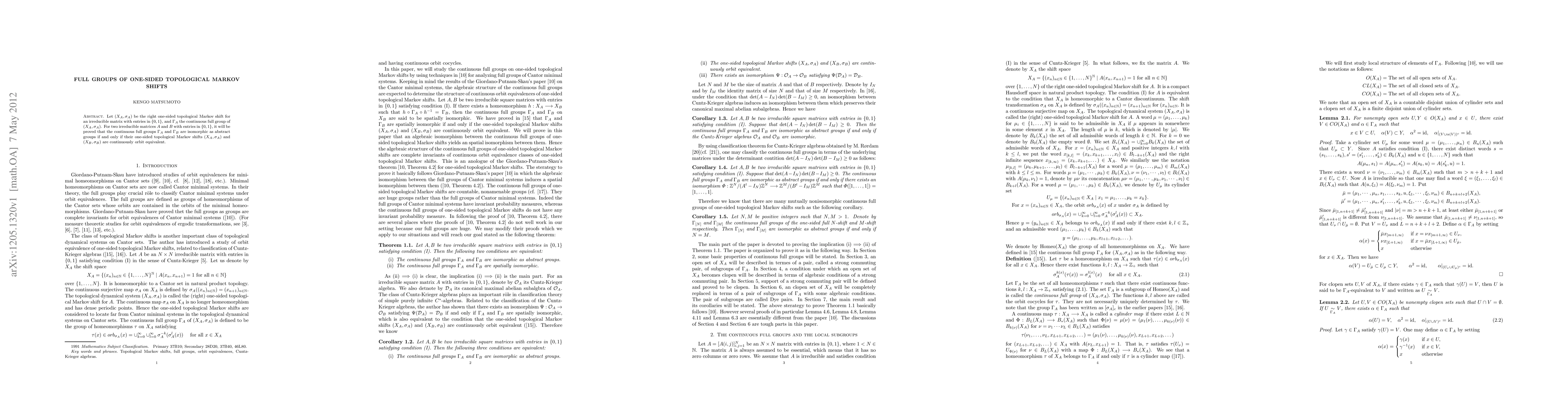 This paper proves that the continuous full groups of one-sided topological Markov shifts are isomorphic as abstract groups if and only if the corresponding Markov shifts are continuously orbit equivalent. This establishes a deep connection between the algebraic structure of these groups and the topological dynamics of the Markov shifts.