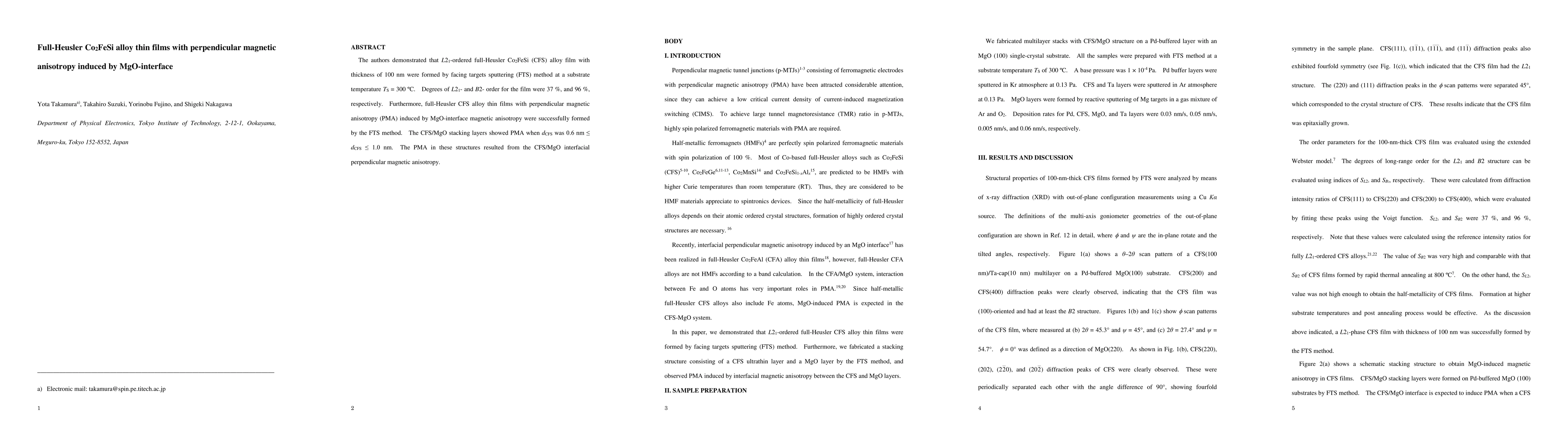 The authors demonstrated a new method for forming full-Heusler Co2FeSi alloy thin films with perpendicular magnetic anisotropy using facing targets sputtering (FTS) method.