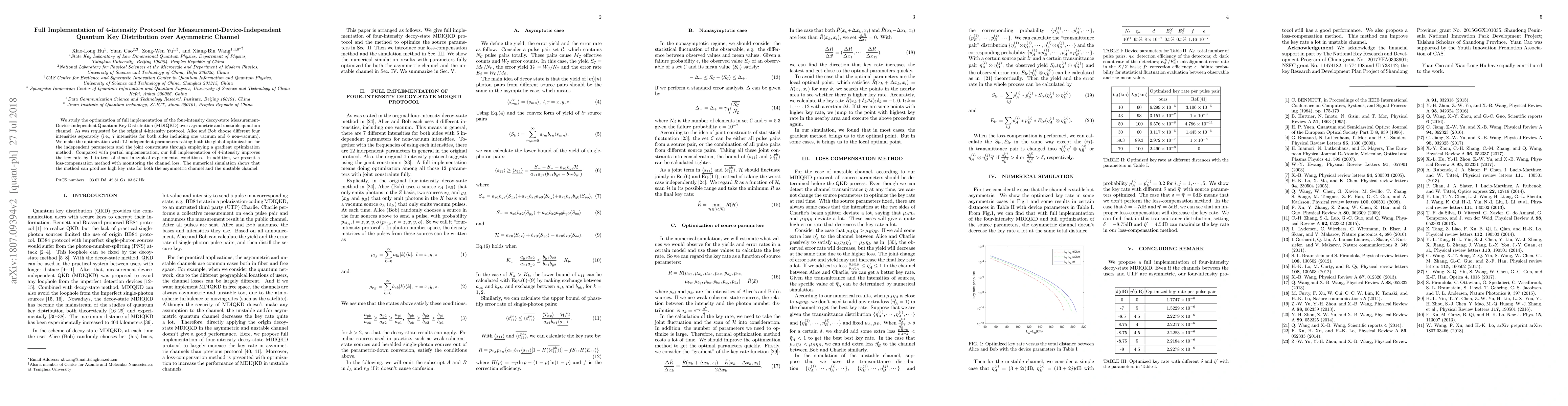 Summary: This paper explores the optimization of a full implementation of the four-intensity decoy-state Measurement-Device-Independent Quantum Key Distribution (MDIQKD) protocol over asymmetric and unstable quantum channels, aiming to enhance security and efficiency in quantum communication.