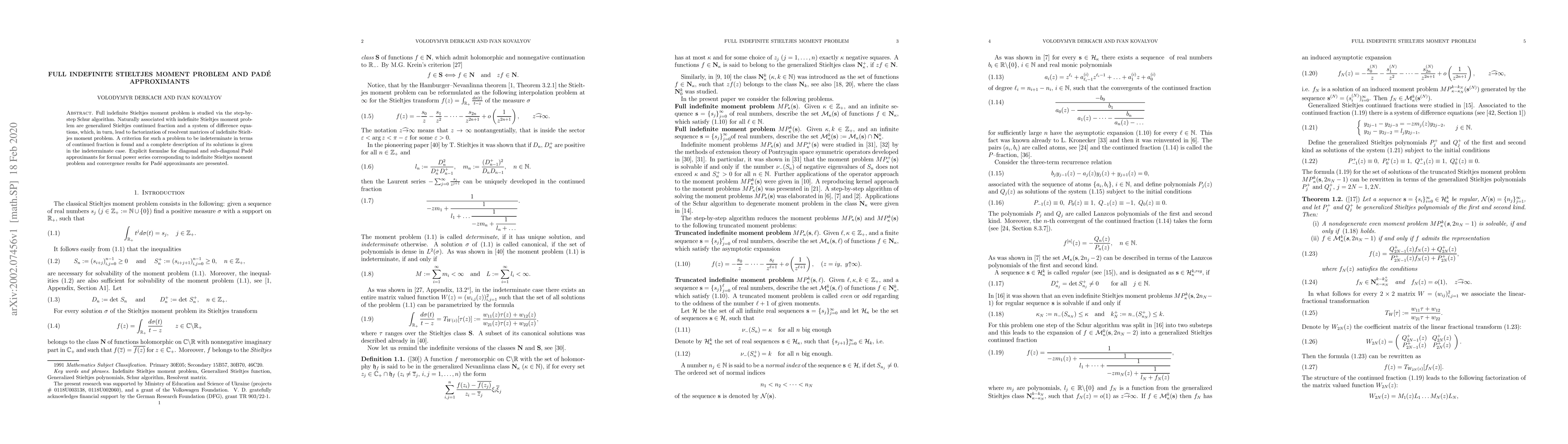 This paper explores the full indefinite Stieltjes moment problem using the Schur algorithm, deriving a criterion for indeterminacy and providing a complete solution description. It also presents explicit formulae for diagonal and sub-diagonal Padé approximants for the associated formal power series and discusses their convergence.