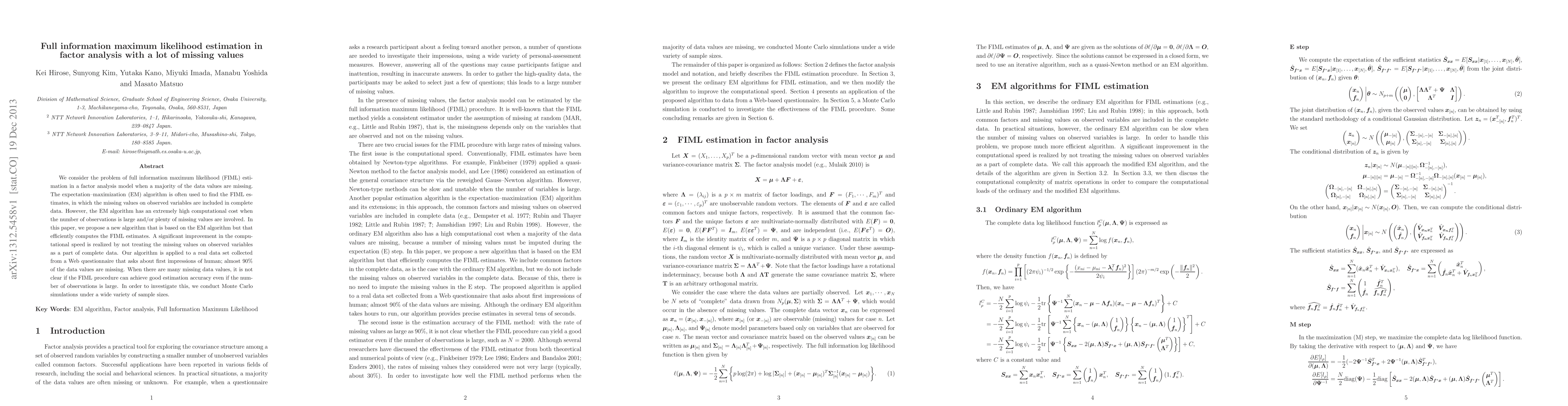 This paper proposes a new algorithm to efficiently compute full information maximum likelihood (FIML) estimates in factor analysis for datasets with extensive missing values, addressing the high computational cost of the traditional EM algorithm. The new method avoids treating missing values as part of complete data, significantly improving computational speed.