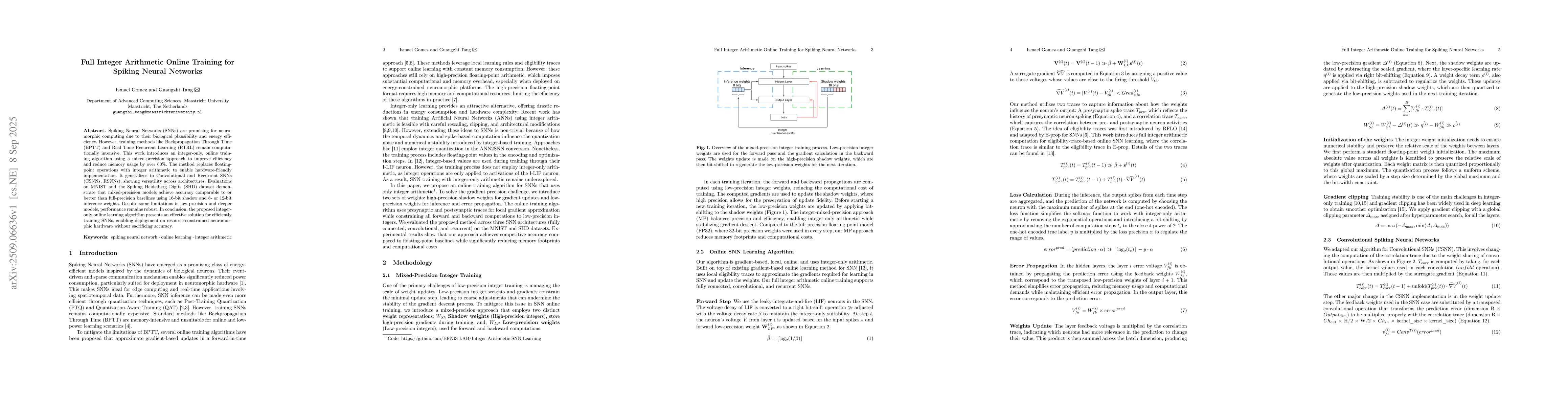 Spiking Neural Networks (SNNs) are promising for neuromorphic computing due to their biological plausibility and energy efficiency. However, training methods like Backpropagation Through Time (BPTT) and Real Time Recurrent Learning (RTRL) remain computationally intensive. This work introduces an integer-only, online training algorithm using a mixed-precision approach to improve efficiency and reduce memory usage by over 60%. The method replaces floating-point operations with integer arithmetic to enable hardware-friendly implementation. It generalizes to Convolutional and Recurrent SNNs (CSNNs, RSNNs), showing versatility across architectures. Evaluations on MNIST and the Spiking Heidelberg Digits (SHD) dataset demonstrate that mixed-precision models achieve accuracy comparable to or better than full-precision baselines using 16-bit shadow and 8- or 12-bit inference weights. Despite some limitations in low-precision and deeper models, performance remains robust. In conclusion, the proposed integer-only online learning algorithm presents an effective solution for efficiently training SNNs, enabling deployment on resource-constrained neuromorphic hardware without sacrificing accuracy.