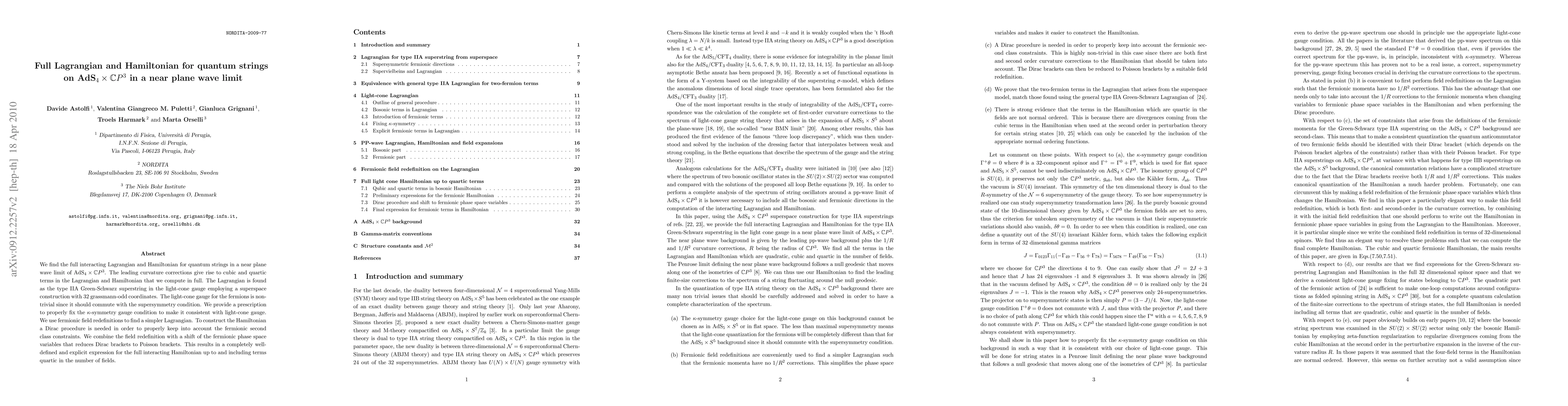 This paper presents the full interacting Lagrangian and Hamiltonian for quantum strings in a near plane wave limit of AdS_4 x CP^3, incorporating leading curvature corrections. The authors employ a type IIA Green-Schwarz superstring in the light-cone gauge, using a superspace construction and kappa-symmetry gauge fixing, and derive a simplified Lagrangian and a well-defined Hamiltonian up to quartic terms.