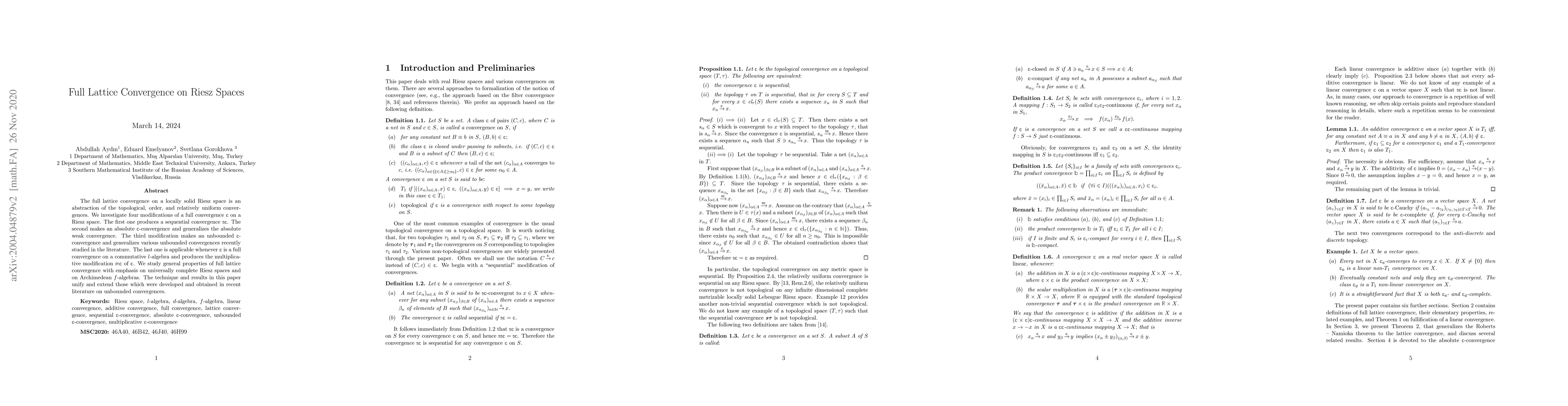 This paper investigates various modifications of full lattice convergence on Riesz spaces, including sequential, absolute, unbounded, and multiplicative types, and examines their properties with a focus on universally complete Riesz spaces and Archimedean f-algebras. The study extends and unifies recent advancements in the theory of unbounded convergences.