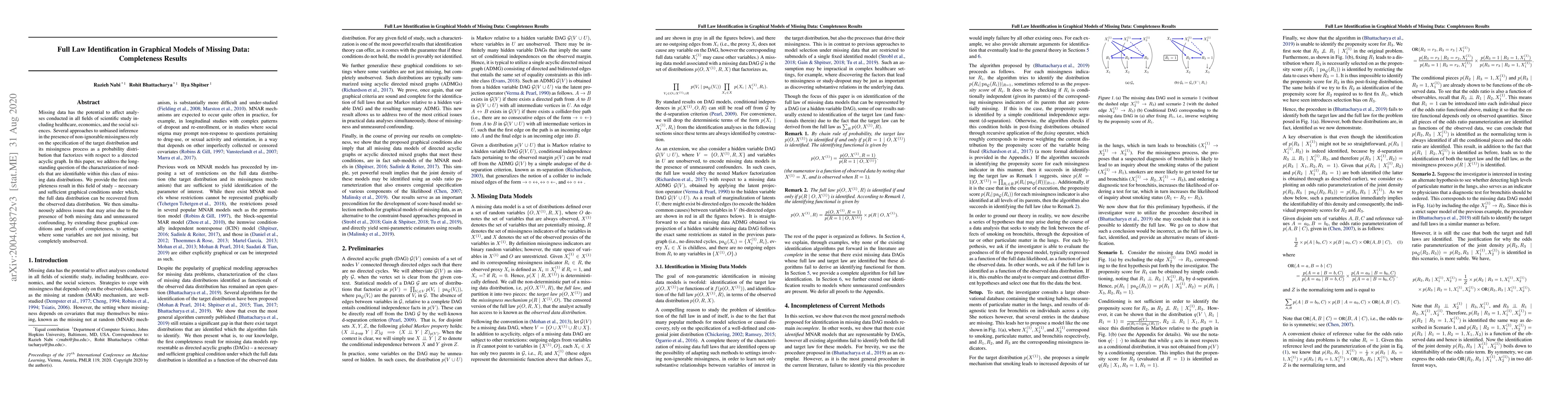 This paper presents the first completeness results for identifying full data distributions in graphical models with missing data, providing necessary and sufficient graphical conditions for recovery. It extends these findings to scenarios involving both missing and completely unobserved variables, addressing challenges posed by unmeasured confounding.