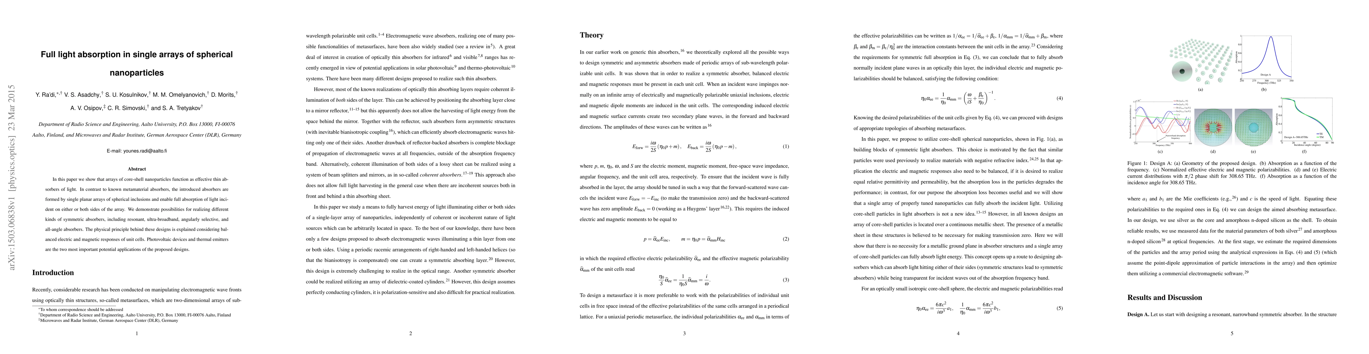 In this paper we show that arrays of core-shell nanoparticles function as effective thin absorbers of light. In contrast to known metamaterial absorbers, the introduced absorbers are formed by single planar arrays of spherical inclusions and enable full absorption of light incident on either or both sides of the array. We demonstrate possibilities for realizing different kinds of symmetric absorbers, including resonant, ultra-broadband, angularly selective, and all-angle absorbers. The physical principle behind these designs is explained considering balanced electric and magnetic responses of unit cells. Photovoltaic devices and thermal emitters are the two most important potential applications of the proposed designs.