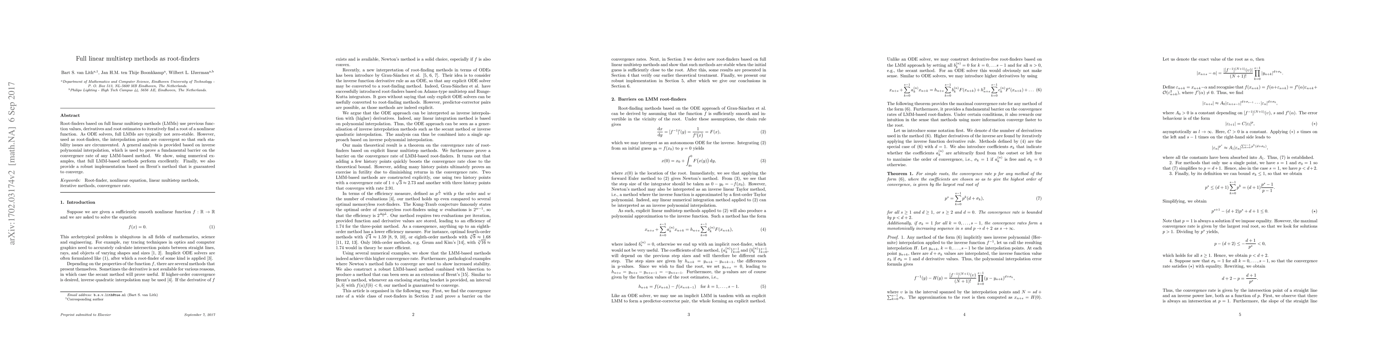 Root-finders based on full linear multistep methods (LMMs) use previous function values, derivatives and root estimates to iteratively find a root of a nonlinear function. As ODE solvers, full LMMs are typically not zero-stable. However, used as root-finders, the interpolation points are convergent so that such stability issues are circumvented. A general analysis is provided based on inverse polynomial interpolation, which is used to prove a fundamental barrier on the convergence rate of any LMM-based method. We show, using numerical examples, that full LMM-based methods perform excellently. Finally, we also provide a robust implementation based on Brent's method that is guaranteed to converge.