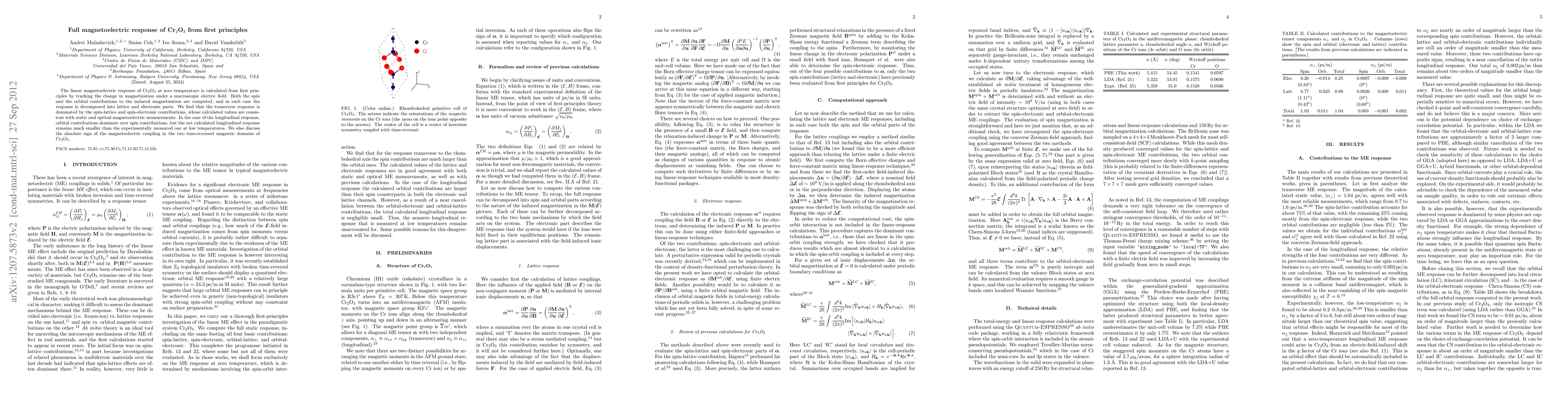 This paper calculates the magnetoelectric response of Cr2O3 from first principles, finding that spin-lattice and spin-electronic contributions dominate the transverse response, while orbital contributions are more significant for the longitudinal response. The calculated values align with experimental measurements for transverse response but fall short for longitudinal response.